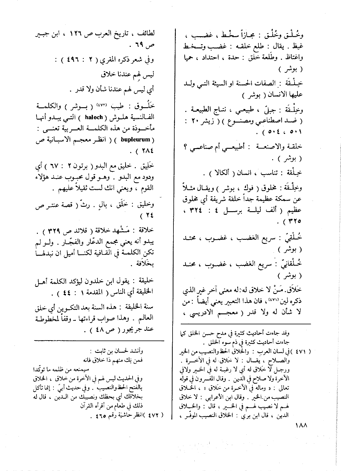 خلاقة: مشهد خلاقة (قلائد ص329) يبدو إنه يعني مجمع الدعّار والفجّار. ولو لم تكن الكلمة في القافية لكنا أميل ان نبدلها بخَلاَفة.