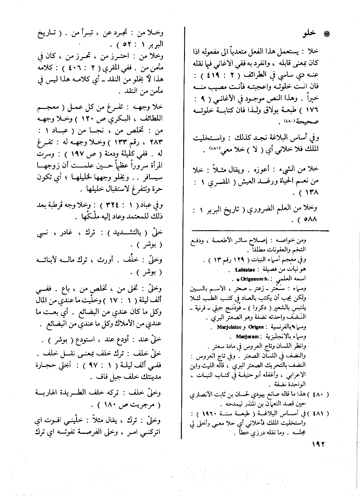 • خلو: خلا: يستعمل هذا الفعل متعدياً إلى مفعوله إذا كان بمعنى قابله، وانفرد به ففي الأغاني فيما نقله عنه دي ساسي في الطرائف (2: 419): فإن أنت خلوته وأعجبته فأنت مصيب منه خيراً. وهذا النص موجود في الأغاني (9: 176) طبعة بولاق ولذا فان كتابة خلوته صحيحة.