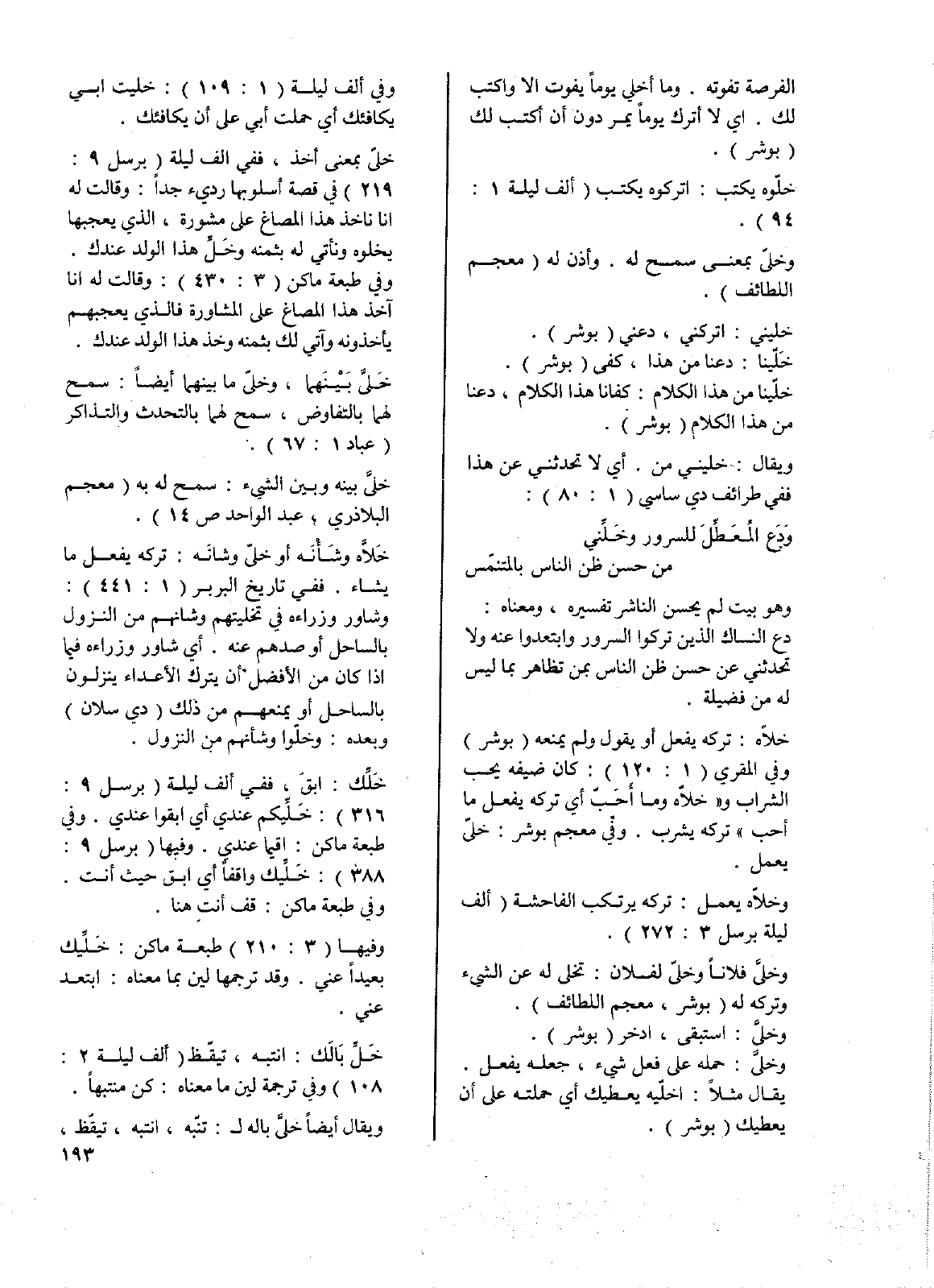 خلّى بمعنى أخذ، ففي ألف ليلة (برسل 9: 219) في قصة أسلوبها رديء جداً: قالت له أنا ماخذ هذا المصاغ على مشورة، الذي يعجبها يخلوه ونأتي له بثمنه وخَلِّ هذا الولد عندك. وفي طبعة ماكن (3: 430): وقالت له أنا آخذ هذا المصاغ على المشاورة فالذي يعجبهم يأخذونه وآتي لك بثمنه وخذ هذا الولد عندك.