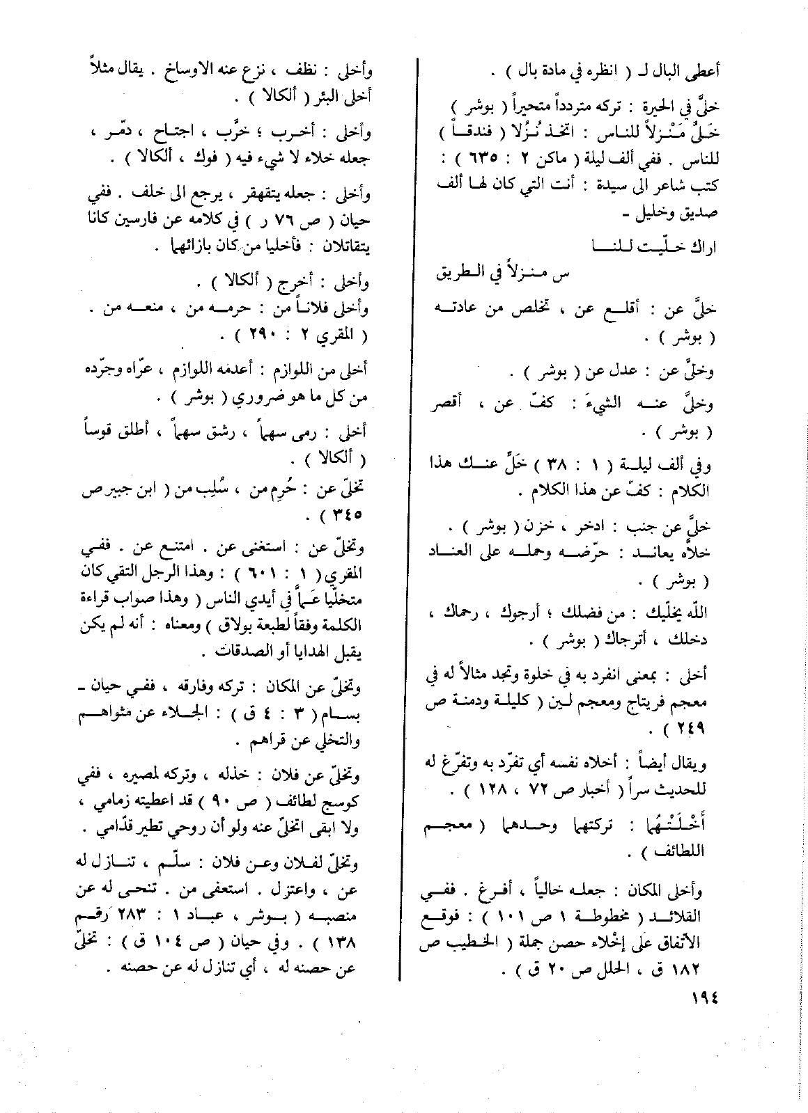 وأخلى: جعله يتقهقر، يرجع إلى خلف. ففي حيان (ص76 ر) في كلامه عن فارسين كانا يتقاتلان: فأخليا من كان بازائهما.