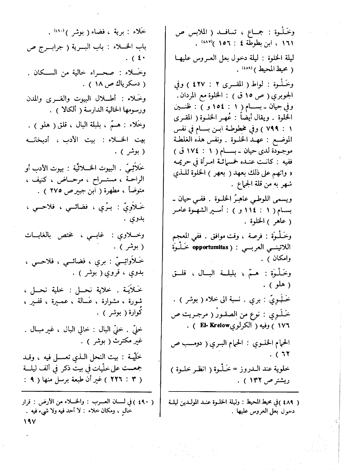 وخَلْوة: لواط (المقري 2: 427) وفي الجوبري (ص15 ق): الخلوة مع المردان. وفي حيان - بسام (1: 154و): ظنين الخلوة. ويقال أيضاً: عُهر الخلوة (المقري 1: 799) وفي مخطوطة ابن بسام في نفس الموضع: عهد الخلوة. ونفس هذه الغلطة موجودة لدى حيان - بسام (1: 174ق) ففيه: كانت عنده خمسمائة امرأة في حريمه (واتهم على ذلك بعهد (بعهر) الخلوة للذي شهر به من قلة الجماع).