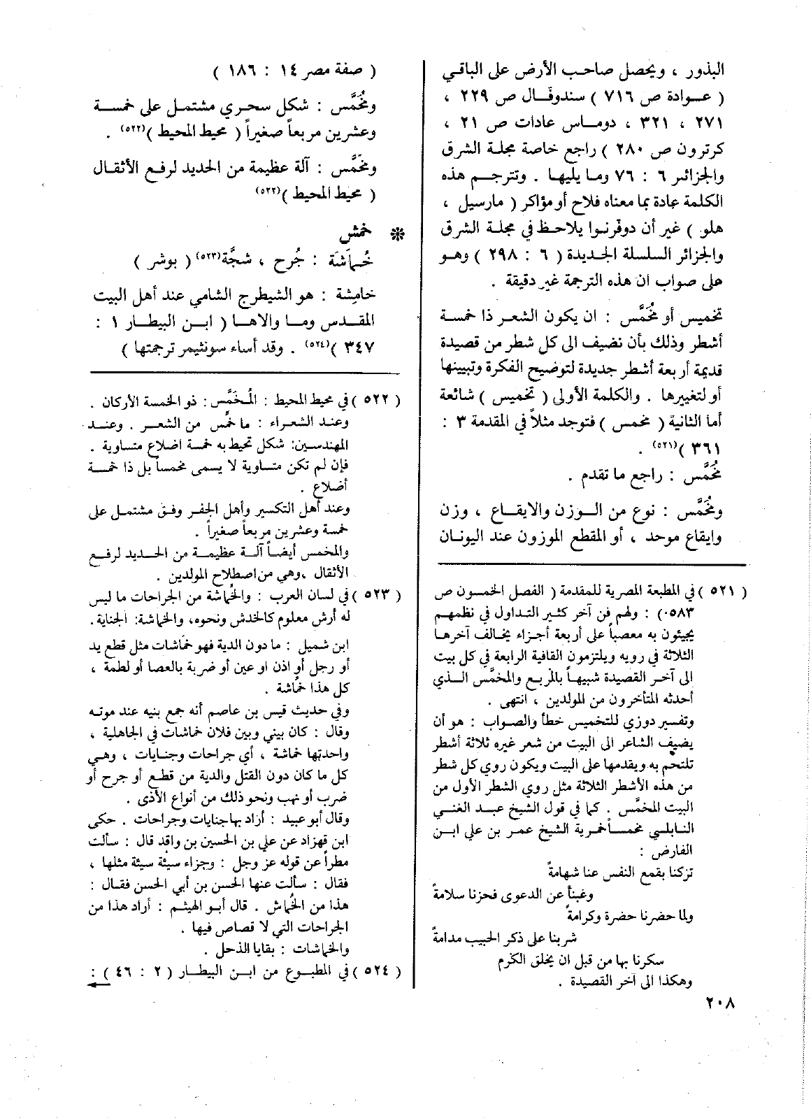 ومُخَمَّس: نوع من الوزن والإيقاع، وزن وإيقاع موحد، أو المقطع الموزون عند اليونان (صفة مصر 14: 186).