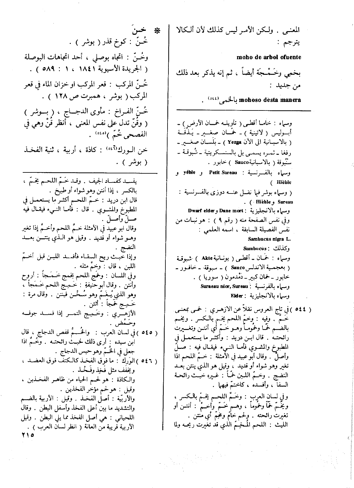 المعنى. ولكن الأمر ليس كذلك لأن ألكالا يترجم: moho de arbol ofuente بخمي وخَمْجَة أيضاً، ثم إنه يذكر بعد ذلك من جديد: mohoso desta manera بالخمى.