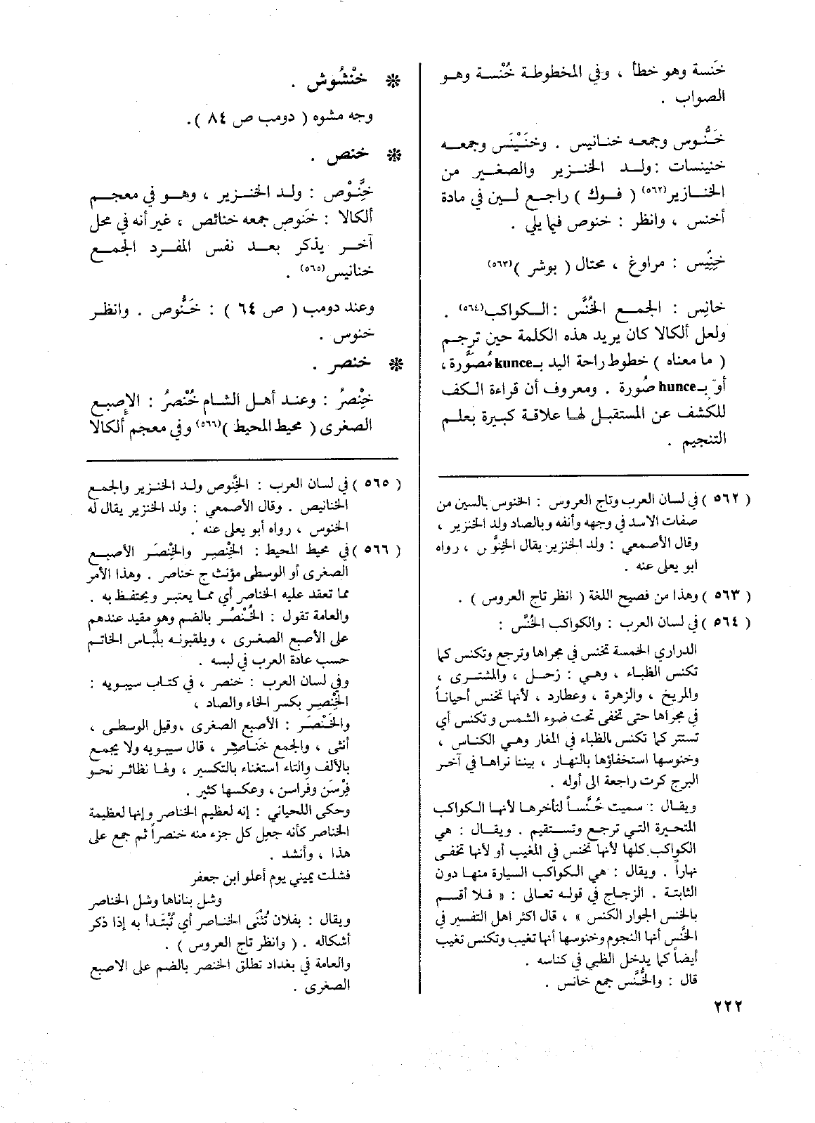 خانِس: الجمع الخُنَّس: الكواكب. ولعل ألكالا كان يريد هذه الكلمة حين ترجم (ما معناه) خطوط راحة اليد ب kunce مُصَوّرة، أو ب hunce صُورة. ومعروف أن قراءة الكف للكشف عن المستقبل لها علاقة كبيرة بعلم التنجيم.