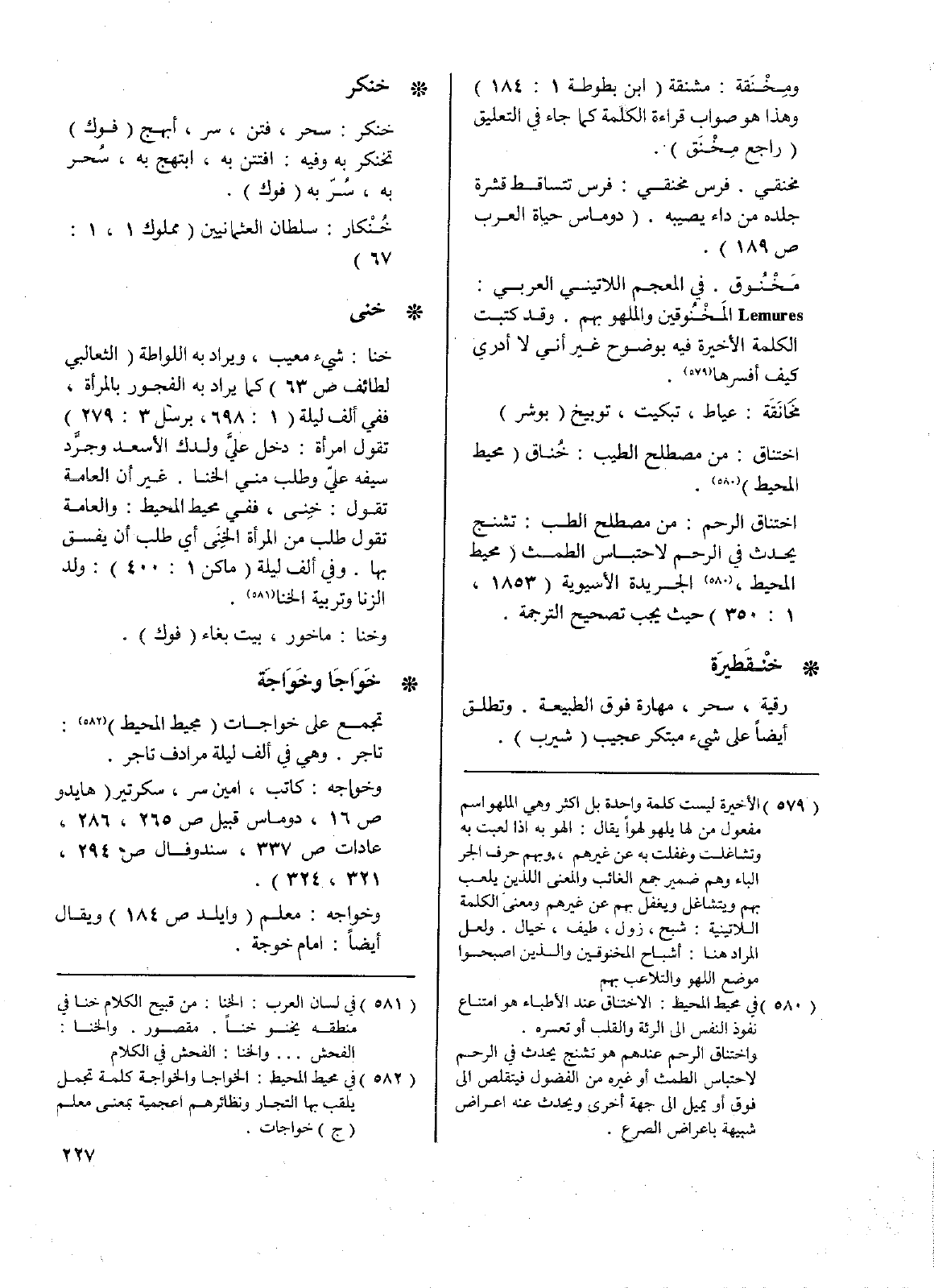 • خنى: خنا: شيء معيب، ويراد به اللواطة (الثعالبي لطائف ص63) كما يراد به الفجور بالمرأة، ففي ألف ليلة (1: 698، برسل 3: 279) تقول امرأة: دخل عليّ ولدك الأسعد وجرد سيفه علي وطلب مني الخنا. غير أن العامة تقول: خنى، ففي محيط المحيط: والعامة تقول طلب من المرأة الخِنى أي طلب أن يفسق بها. وفي ألف ليلة (ماكن 1: 400): ولد الزنا وتربية الخنا.