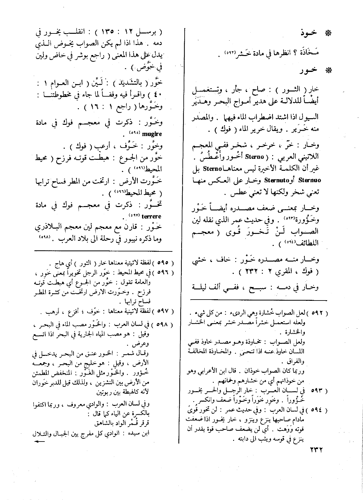 وخار: خر، خرخر، شخر ففي المعجم اللاتيني العربي: ( Sterno أخور وأغطس. غير أن الكلمة الأخيرة ليس معناها Sterno بل Sternuo أو Sternuto وخار على العكس منها تعني شخر ولكنها لا تعني عطس.