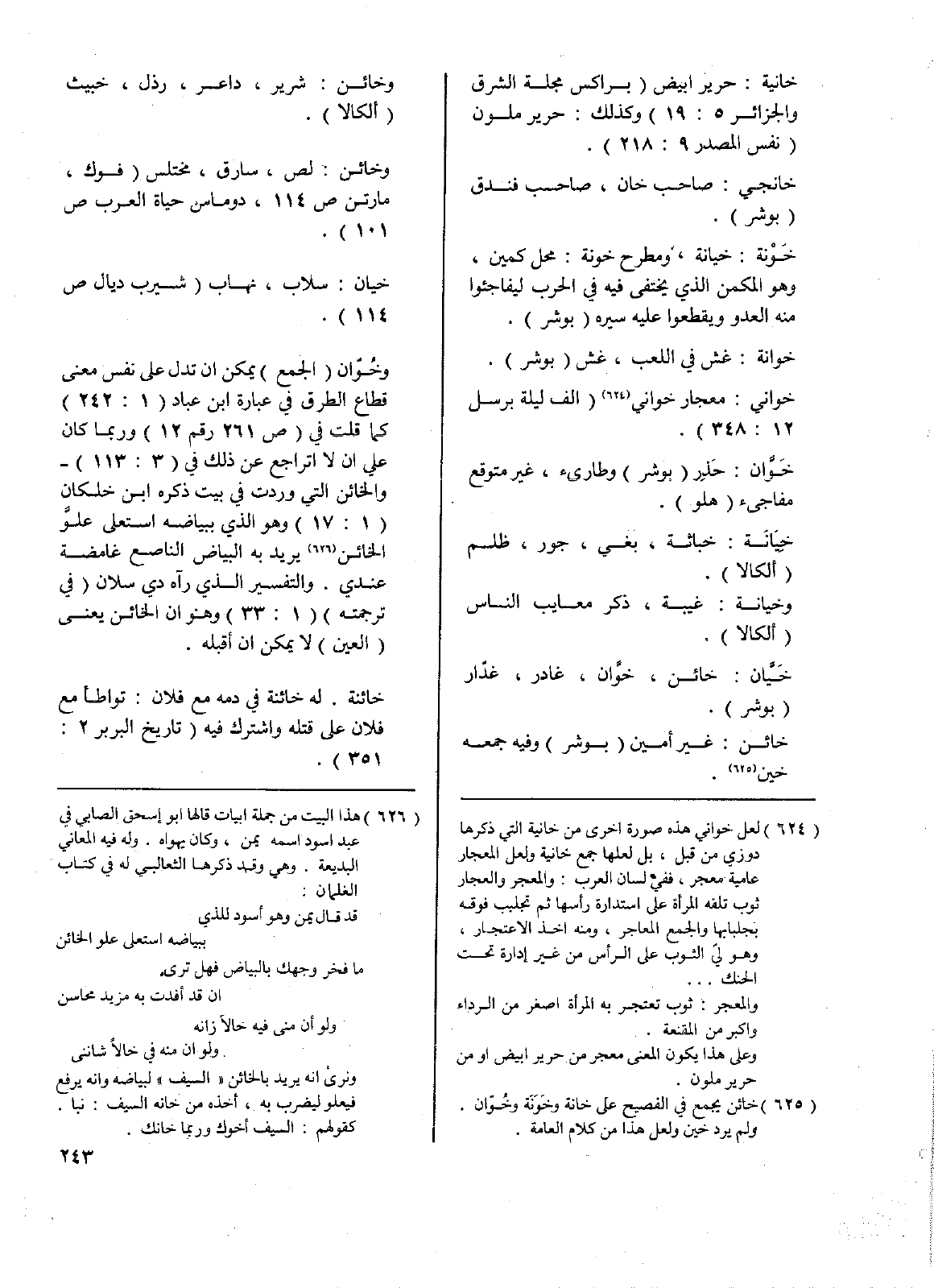 وخوان (الجمع) يمكن أن تدل على نفس معنى قطاع الطرق في عبارة ابن عباد (1: 242) كما قلت في (ص261 رقم 12) وربما كان علي أن لا أتراجع عن ذلك في (3: 113) -والخائن التي وردت في بيت ذكره ابن خلكان (1: 17) وهو الذي ببياضه استعلى علو الخائن يريد به البياض الناصع غامضة عندي. والتفسير الذر رآه دي سلان (في ترجته) (1: 33) وهو أن الخائن يعني (العين) لا يمكن أن أقبله.
