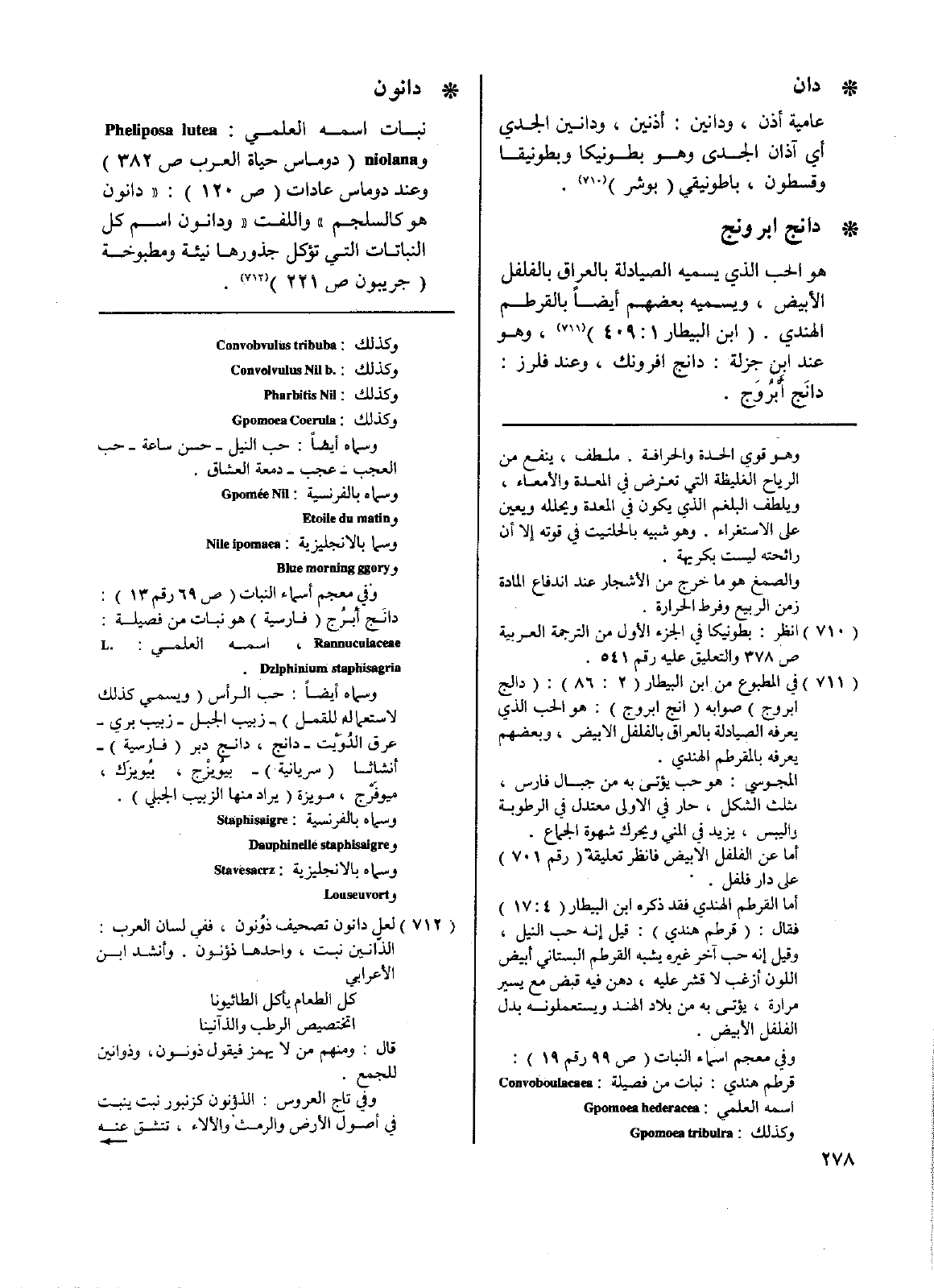 • دانون: نبات اسمه العلمي: Pheliposa Iutea و niolana ( دوماس حياة العرب ص382) وعند دوماس عادات (ص120): (دانون هو كالسجلم) (واللفت) (ودانون اسم كل النباتات التي تؤكل جذورها نيئة ومطبوخة) (جريبون ص221).