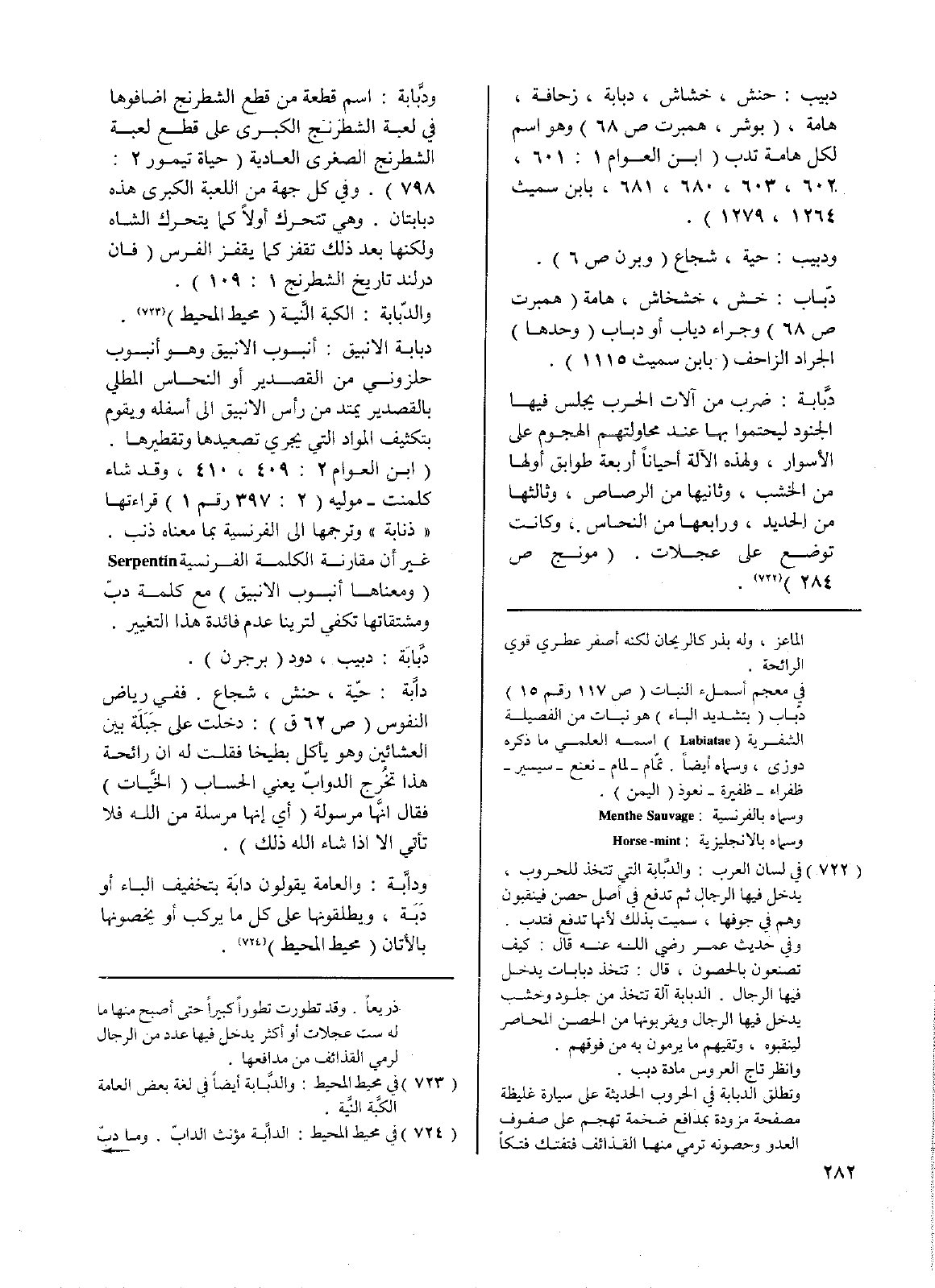 دبابة الانبيق: أنبوب الانبيق وهو أنبوب حلزوني من القصدير أو النحاس المطلي بالقصدير يمتد من رأس الانبيق إلى أسفله ويقوم بتكثيف المواد التي يجري تصعيدها وتقطيرها. (ابن العوام 2: 409، 410، وقد شاء كلمنت - موليه (2: 397 رقم1) قراءتها (ذنابة) وترجمها إلى الفرنسية بما معناه ذنب - غير أن مقارنة الكلمة الفرنسية Serpentin ( ومعناها أنبوب الانبيق) مع كلمة دبّ ومشتقاتها تكفي لترينا عدم فائدة هذا التغيير.