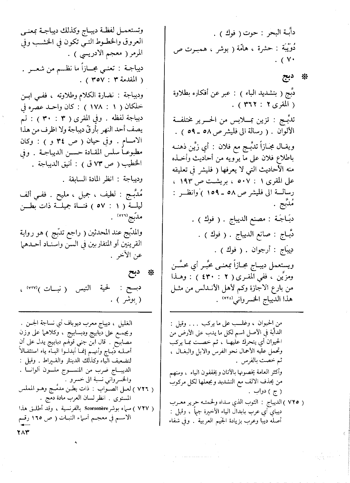 • دبج: دَّبج (بتشديد الباء): عبر عن أفكاره لطلاوة (المقري 2: 362).
