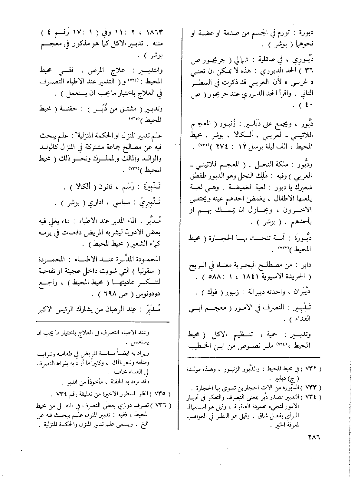 وتدبير: حمية، تنظيم الأكل (محيط المحيط، ملر نصوص من ابن الخطيب 1863، 2: 11 وفي (1: 17 رقم4) منه: تدبير الأكل كما هو مذكور في معجم بوشر).