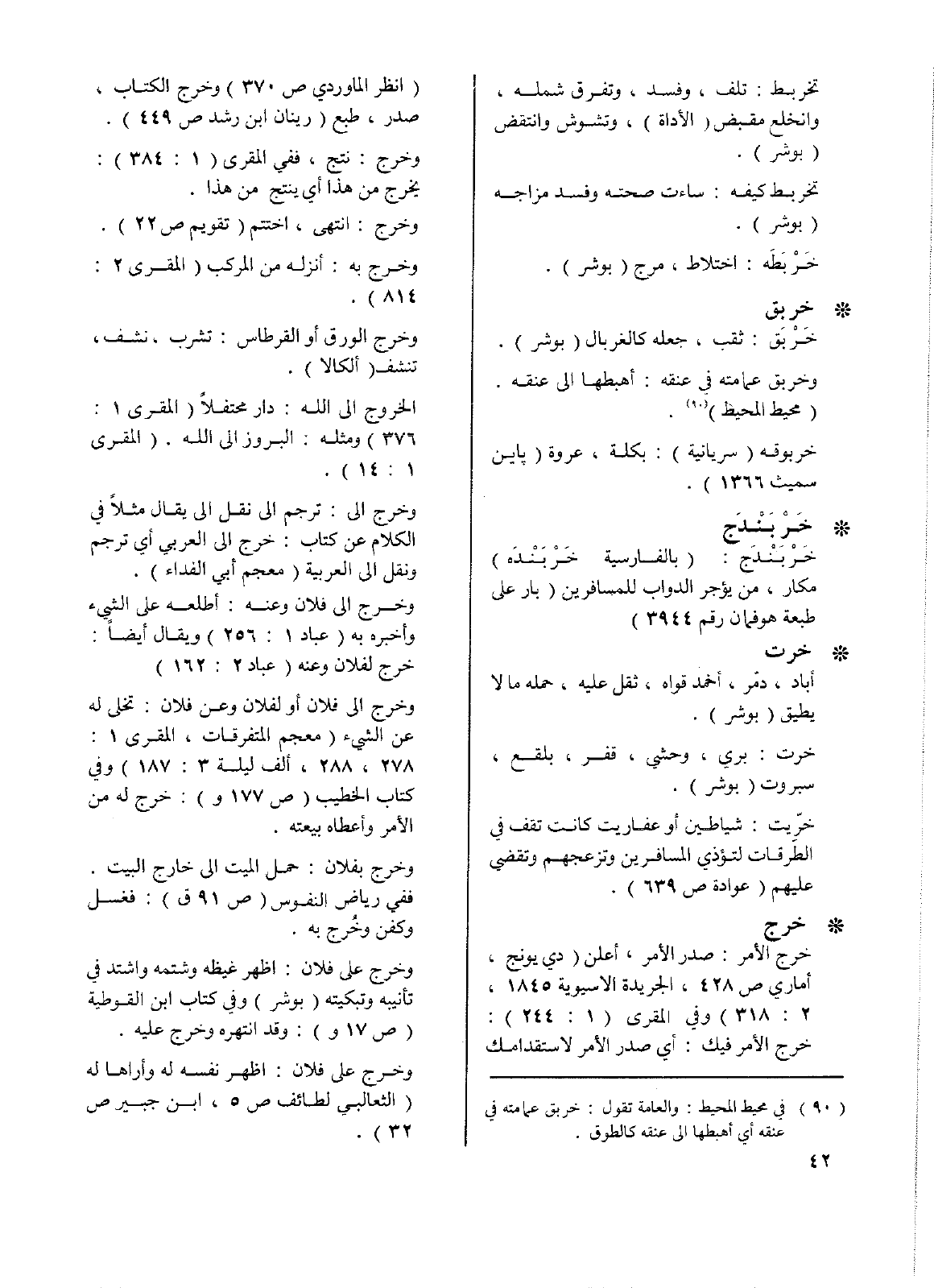 • خرج: خرج الأمر: صدر الأمر، أعلن (دي يونج، أماري ص428، الجريدة الآسيوية 1845، 2: 318) وفي المقري (1: 244): خرج الأمر فيك: أي صدر الأمر لاستقدامك (انظر الماوردي ص370) وخرج الكتاب، صدر، طبع (رينان ابن رشد ص449).