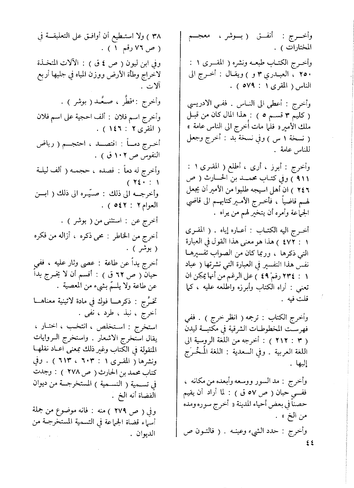 أخرج إليه الكتاب: أعاره إياه. (المقري 1: 472) هذا هو معنى القول في العبارة التي ذكرها، وربما كان من الصواب تفسيرها نفس هذا التفسير في العبارة التي نشرتها (عباد 1: 234 رقم 49) على الرغم من أنها يمكن أن تعني: أراه الكتاب وأبرزه واطلعه عليه، كما قلت فيه.