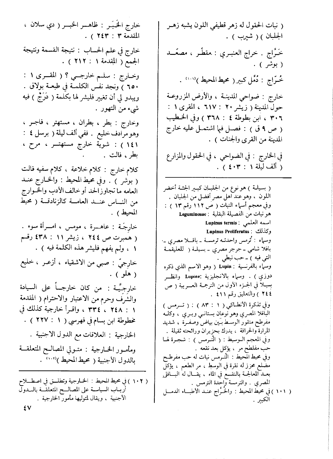 خارج: ضواحي المدينة، والأرض المزروعة حول المدينة (زيشر 20: 617، المقري 1: 306، ابن بطوطة 4: 368) وفي الخطيب (ص9 ق): فصل فيما اشتمل عليه خارج المدينة من القرى والجنات).