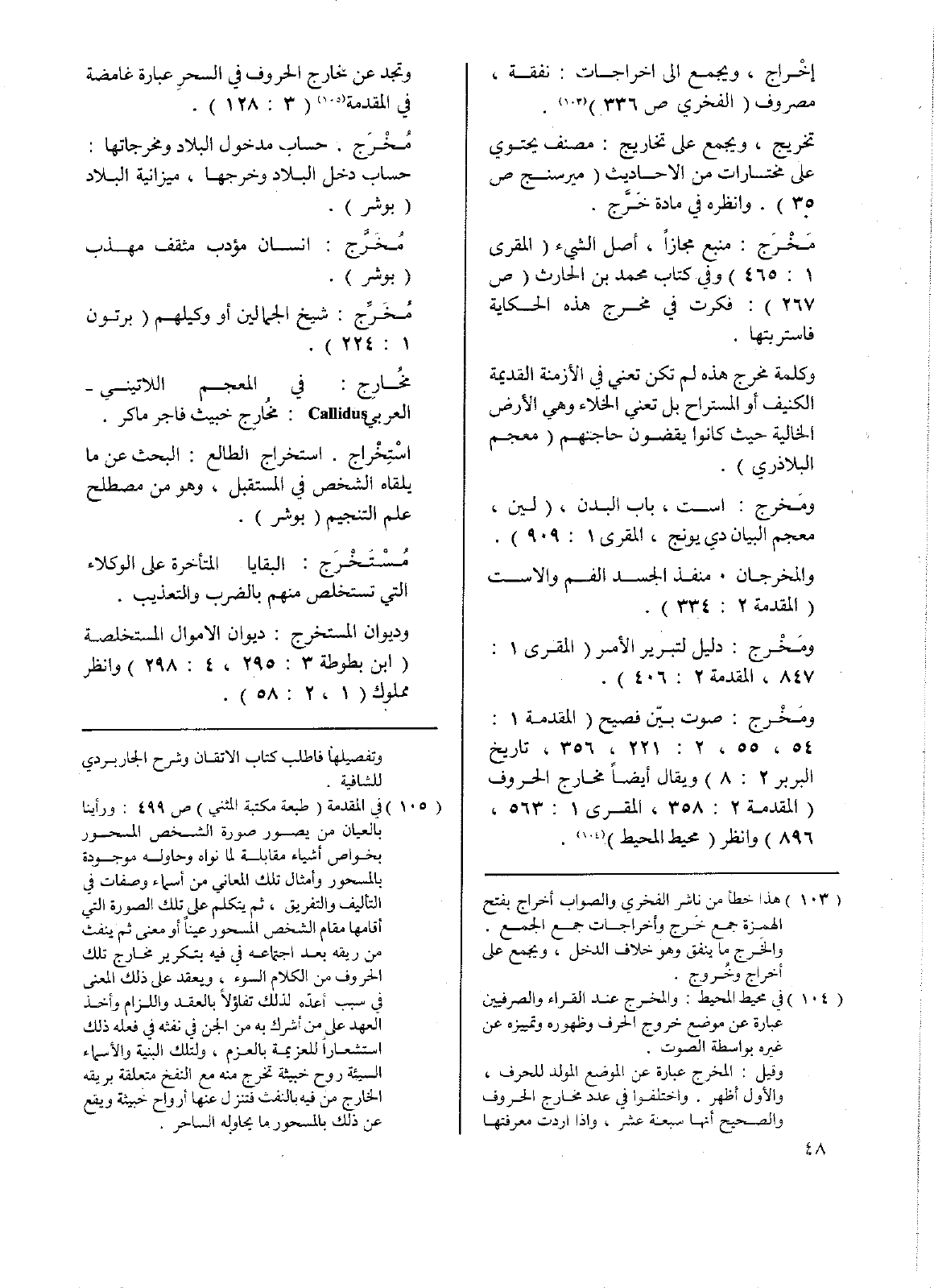 ومَخْرج: صوت بين فصيح (المقدمة 1: 54، 55، 2: 221، 356، تاريخ البربر 2: 8) ويقال أيضاً مخارج الحروف (المقدمة 2: 358، المقري 1: 563، 896) وانظر (محيط المحيط). وتجد عن مخارج الحروف في السحر عبارة غامضة في المقدمة (3: 128).