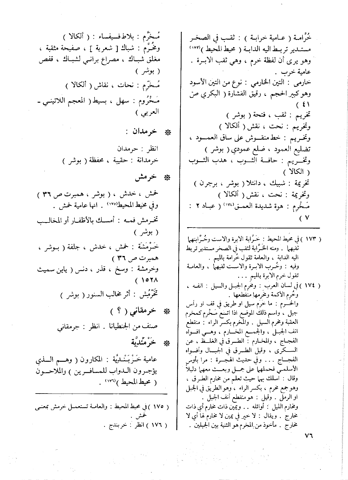 خُرَّامة (عامية خرابة): ثقب في الصخر مستدير تربط إليه الدابة (محيط المحيط) وهو يرى أن لفظة خرم، وهي ثقب الابرة. عامية خرب.