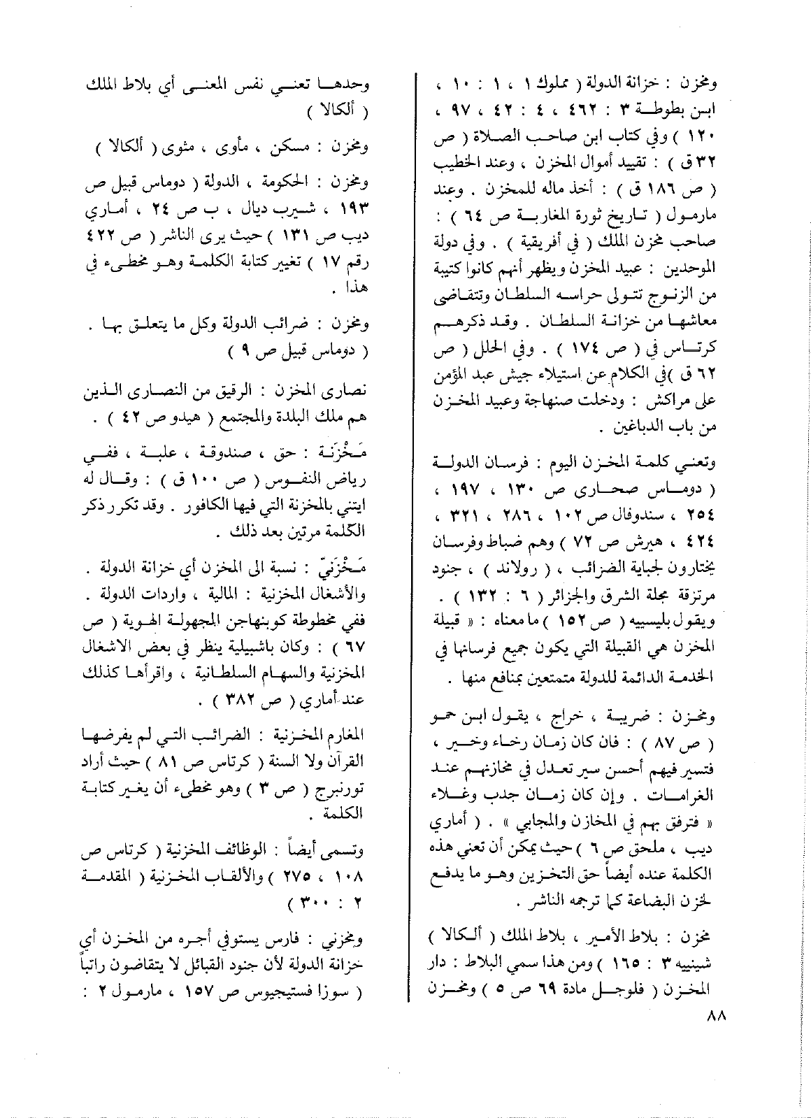ومخزن: خزانة الدولة (مملوك 1، 1: 10، ابن بطوطة 3: 462، 4: 42، 97، 120) وفي كتاب ابن صاحب الصلاة (ص32 ق): تقييد أموال المخزن، وعند الخطيب (ص186 ق): أخذ ماله للمخزن. وعند مارمول (تاريخ ثورة المغاربة ص64): صاحب مخزن الملك (في أفريقية). وفي دولة الموحدين: عبيد المخزن ويظهر أنهم كانوا كتيبة من الزنوج تتولى حراسة السلطان وتتقاضى معاشها من خزانة السلطان. وقد ذكرهم كرتاس في (ص174). وفي الحلل (ص62 ق) في الكلام عن استيلاء جيش عبد المؤمن على مراكش: ودخلت صنهاجة وعبيد المخزن من باب الدباغين.