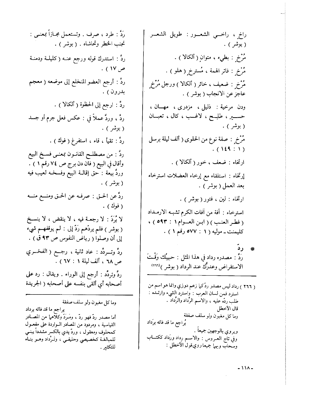 ردَّ: من مصطلح القانون بمعنى فسخ البيع وأقال في البيع (فان دن برج ص74 رقم 1). وردَّ بيعة: حق إقالة البيع وفسخه لعيب فيه (بوشر).