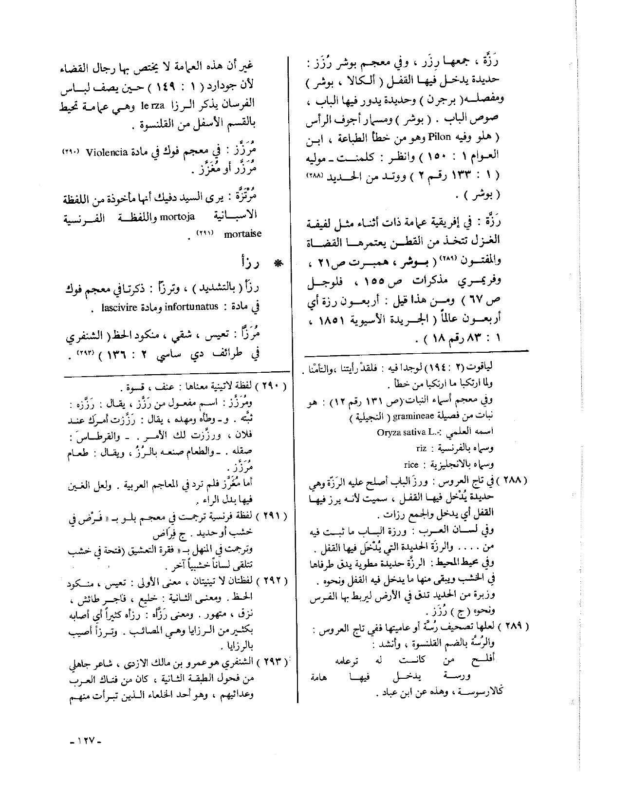 رَزَّة: في أفريقية عمامة ذات أثناء مثل لفيفة الغزل تتخذ من القطن يعتمرها القضاة والمفتون (بوشر، همبرت ص21، وفريمري مذكرات ص155، فلوجل ص67)، ومن هذا قيل: أربعون رزة أي أربعون عالماً (الجريدة الآسيوية 1851، 1: 83 رقم 18).