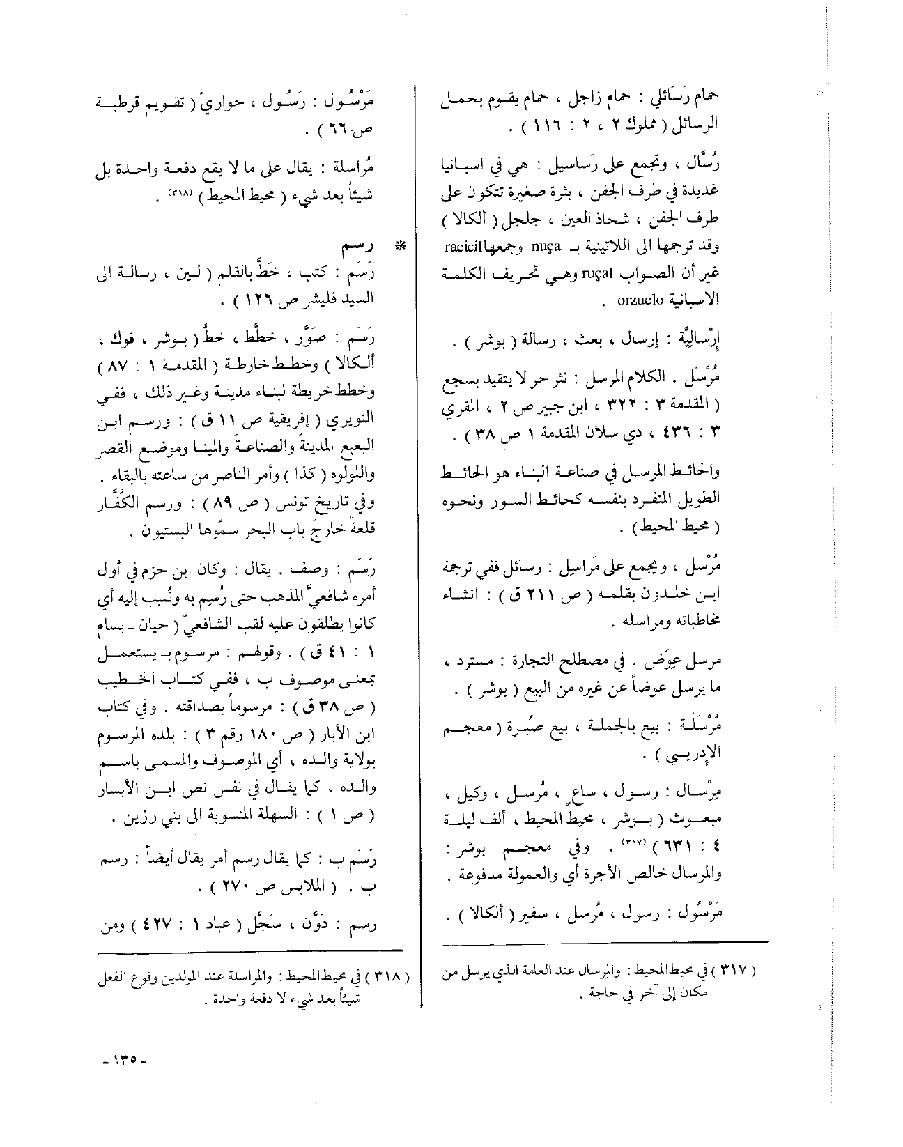 رَسَم: صَوَّر، خطَّط، خطَّ (بوشر، فوك، ألكالا) وخطط خارطة (المقدمة 1: 87) وخطط خريطة لبناء مدينة وغير ذلك، ففي النويري (أفريقية ص11 ق): ورسم ابن البعبع المدينة والصناعة والمينا وموضع القصر واللولوه (كذا) وأمر الناصر من ساعته بالبناء. وفي تاريخ تونس (ص89): ورسم الكُفَّار قلعةً خارج باب البحر سمّوها البستيون.