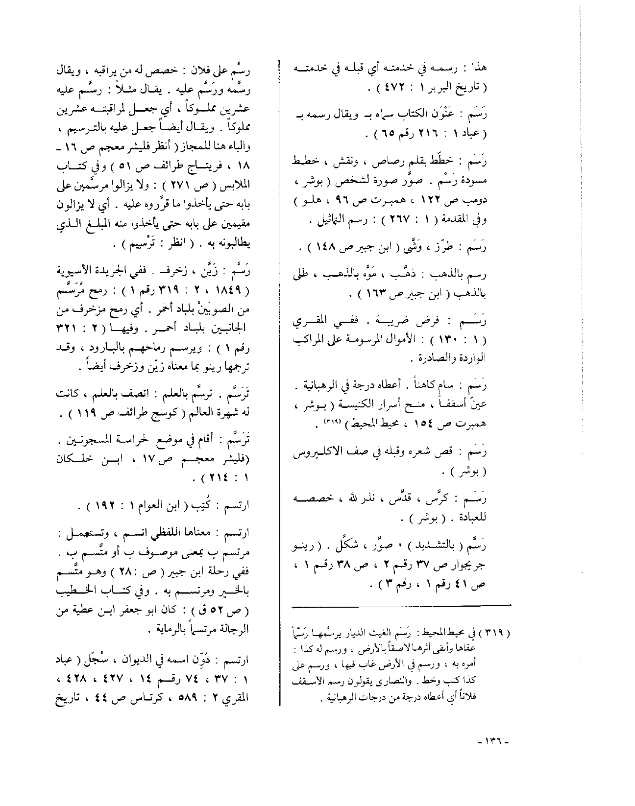 رَسَم: خطّط بقلم رصاص، ونقش، خطط مسودة رَسْم، صوَّر صورة لشخص (بوشر، دومب ص122، همبرت ص96، هلو)، وفي المقدمة (1: 267): رسم التماثيل.