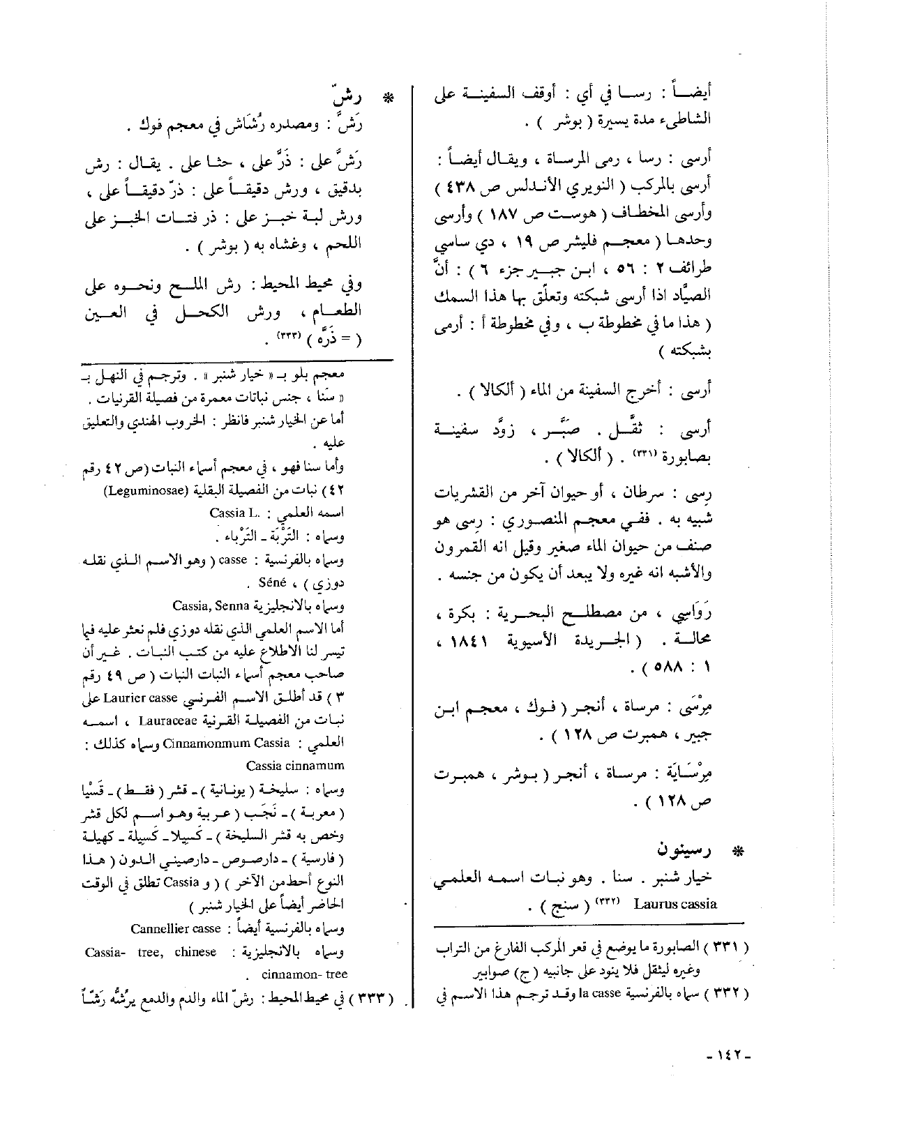 أرسى: رسا، رمى المرساة، ويقال أيضاً: أرسى بالمركب (النويري الأندلس ص438) وأرسى المخطاف (هوست ص187)، وأرسى وحدها (معجم فليشر ص187، دي ساسي طرائف 2: 56، ابن جبير جزء 6): أنَّ الصيَّاد إذا أرسى شبكته وتعلّق بها هذا السمك (هذا ما في مخطوطة ب، وفي مخطوطة أ: أرمى بشبكته).