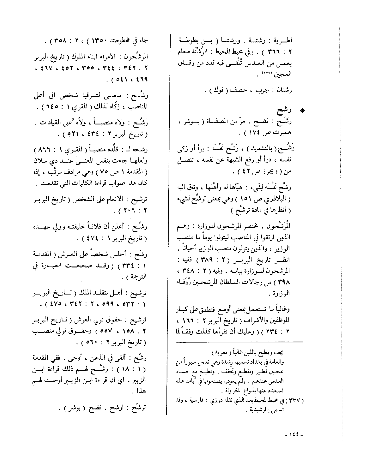 رشحه ل: قلَّده منصباً (المقري 1: 866)، ولعلها جاءت بنفس المعنى عند دي سلان (المقدمة 1 ص75) وهي مرادف مرتَّب، إذا كان هذا صواب قراءة الكلمات التي تقدمت.