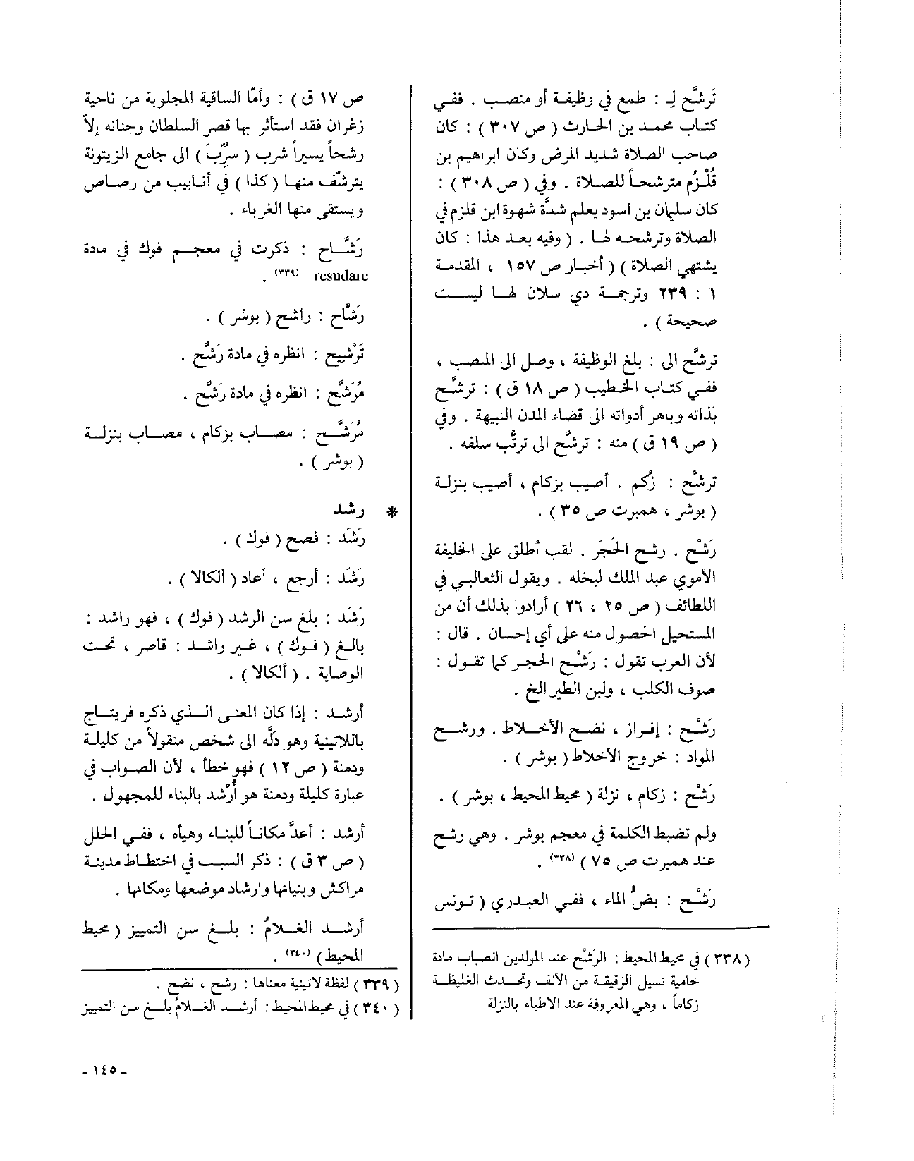 تَرشَّح لِ: طمع في وظيفة أو منصب. ففي كتاب محمد بن الحارث (ص307): كان صاحب الصلاة شديد المرض وكان إبراهيم بن قُلْزُم مترشحاً للصلاة. وفي (ص308): كان سليمان بن سواد يعلم شدَّة شهوة ابن قلزم في الصلاة وترشحه لها، (وفيه بعد هذا: كان يشتهي الصلاة) (أخبار ص157، المقدمة 1: 239 وترجمة دي سلان لها ليست صحيحة).