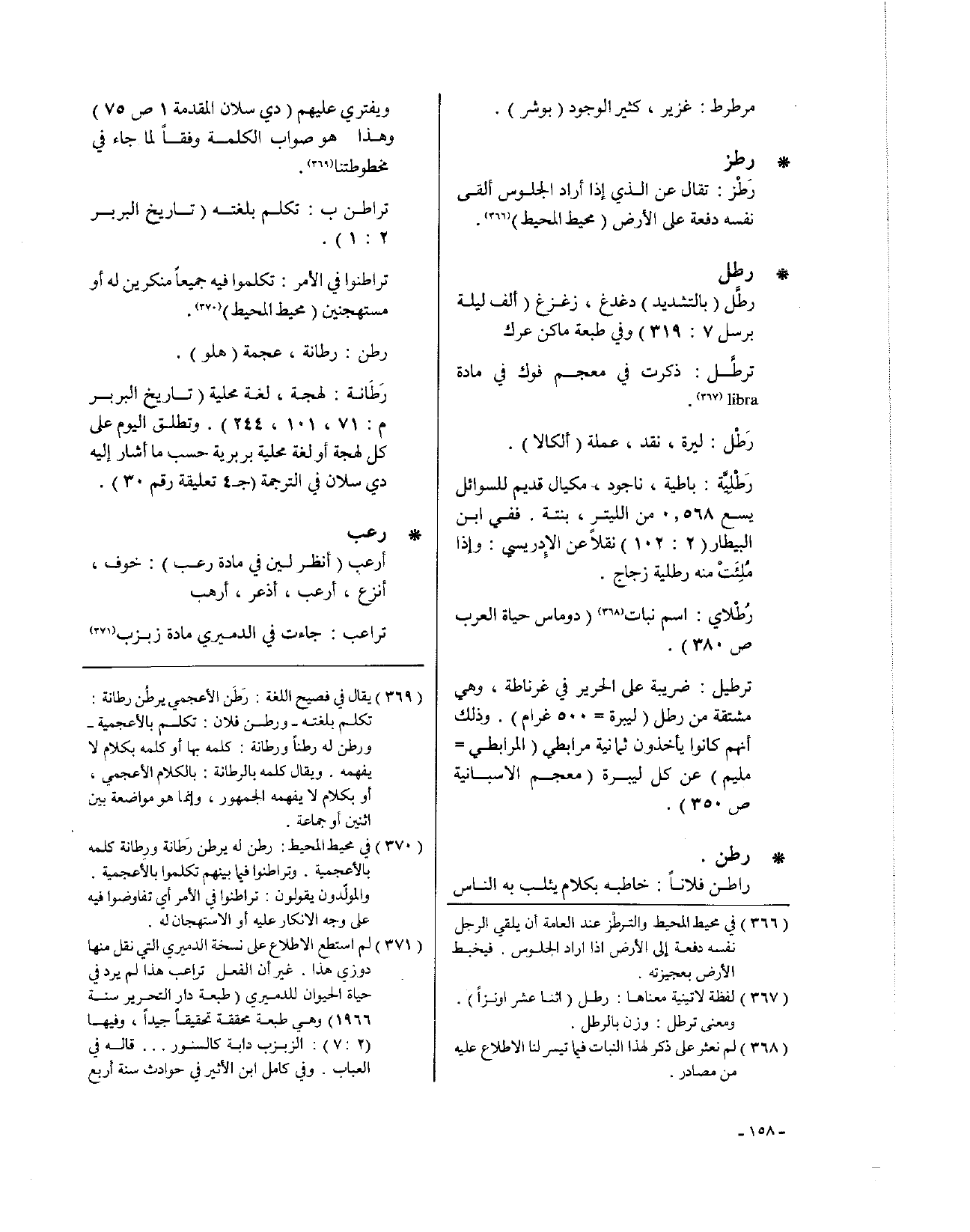 • رطن: راطن فلاناً: خاطبه بكلام يثلب به الناس ويفتري عليهم (دي سلان المقدمة 1 ص75) وهذا هو صواب الكلمة وفقاً لما جاء في مخطوطتنا.