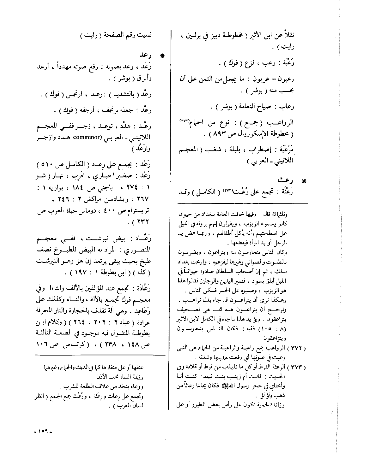 • رعث: رَعْثَة: تجمع على رُعُث (الكامل) وقد نشيت رقم الصفحة (رايت).