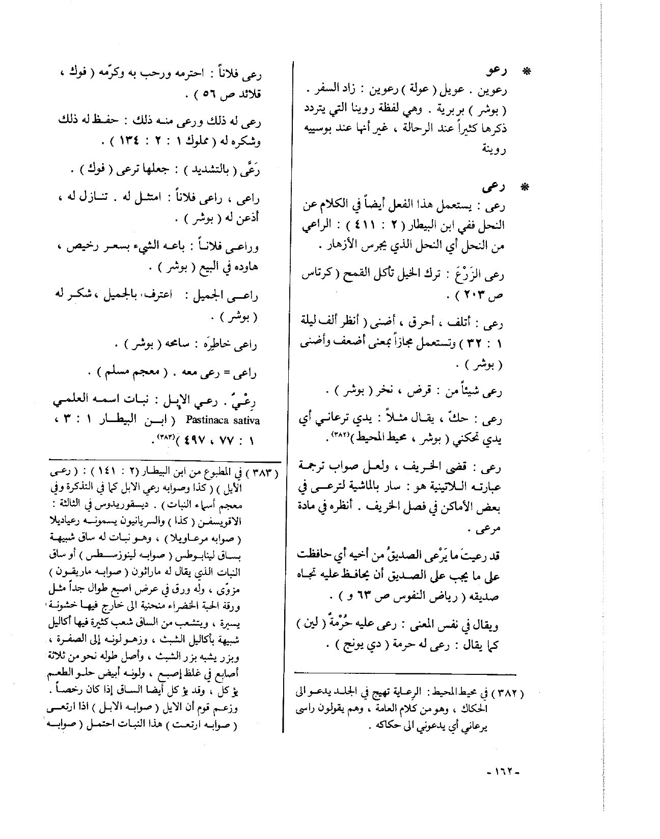 • رعى: رعى: يستعمل هذا الفعل أيضاً في الكلام عن النحل ففي ابن البيطار (2: 411): الراعي من النحل أي النحل الذي يجرس الأزهار.