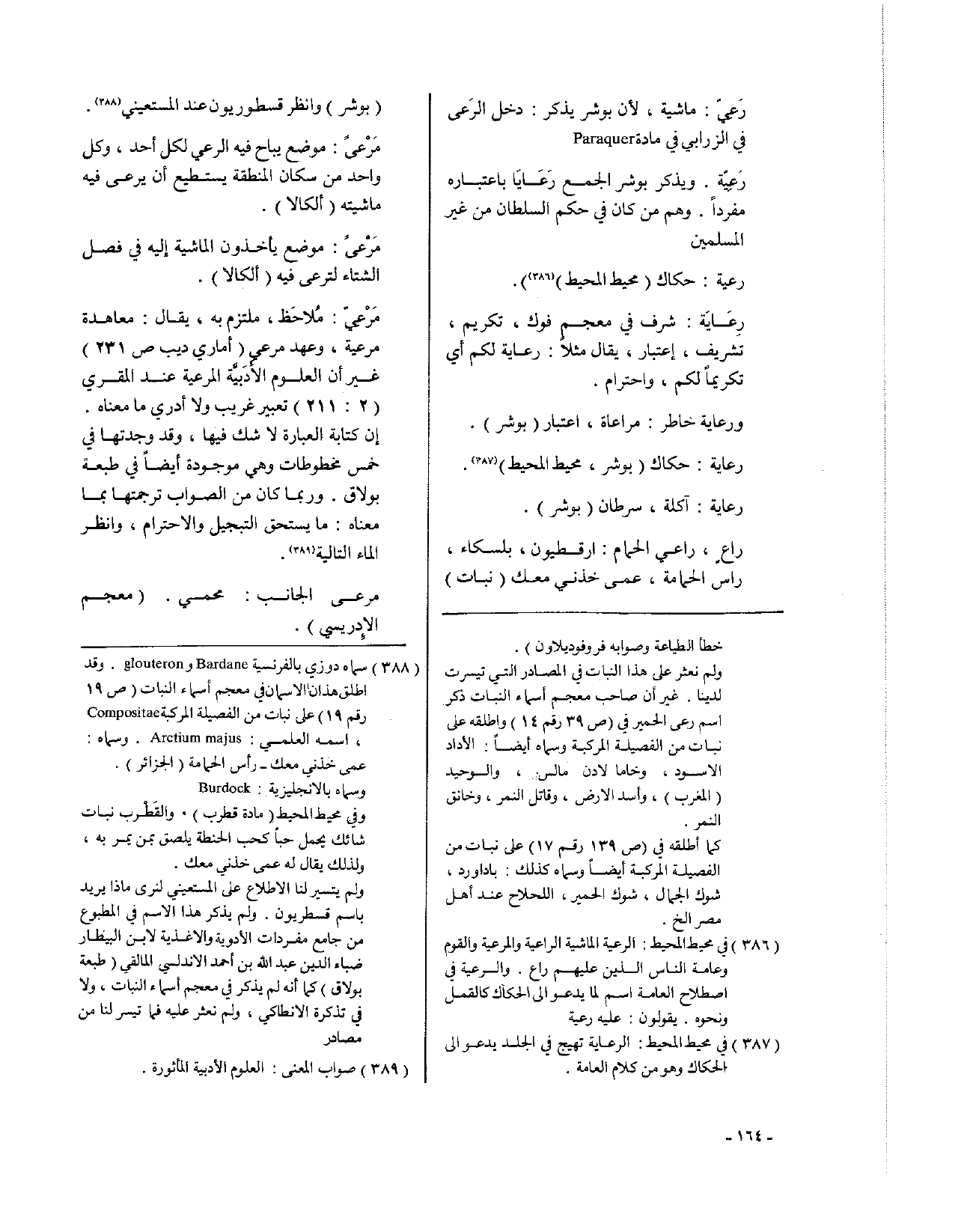 مَرْعِيّ: مُلاحَظ، ملتزم به، يقال: معاهدة مرعية، وعهد مرعي (أماري ديب ص231)، غير أن العلوم الأَدَبيَّة المرعية عند المقري (2: 211) تعبير غريب ولا أدري ما معناه. إن كتابة العبارة لاشك فيها، وقد وجدتها في خمس مخطوطات وهي موجودة أيضاً في طبعة بولاق، وربما كان من الصواب ترجمتها بما معناه: ما يستحق التبجيل والاحترام، وانظر المادة التالية.