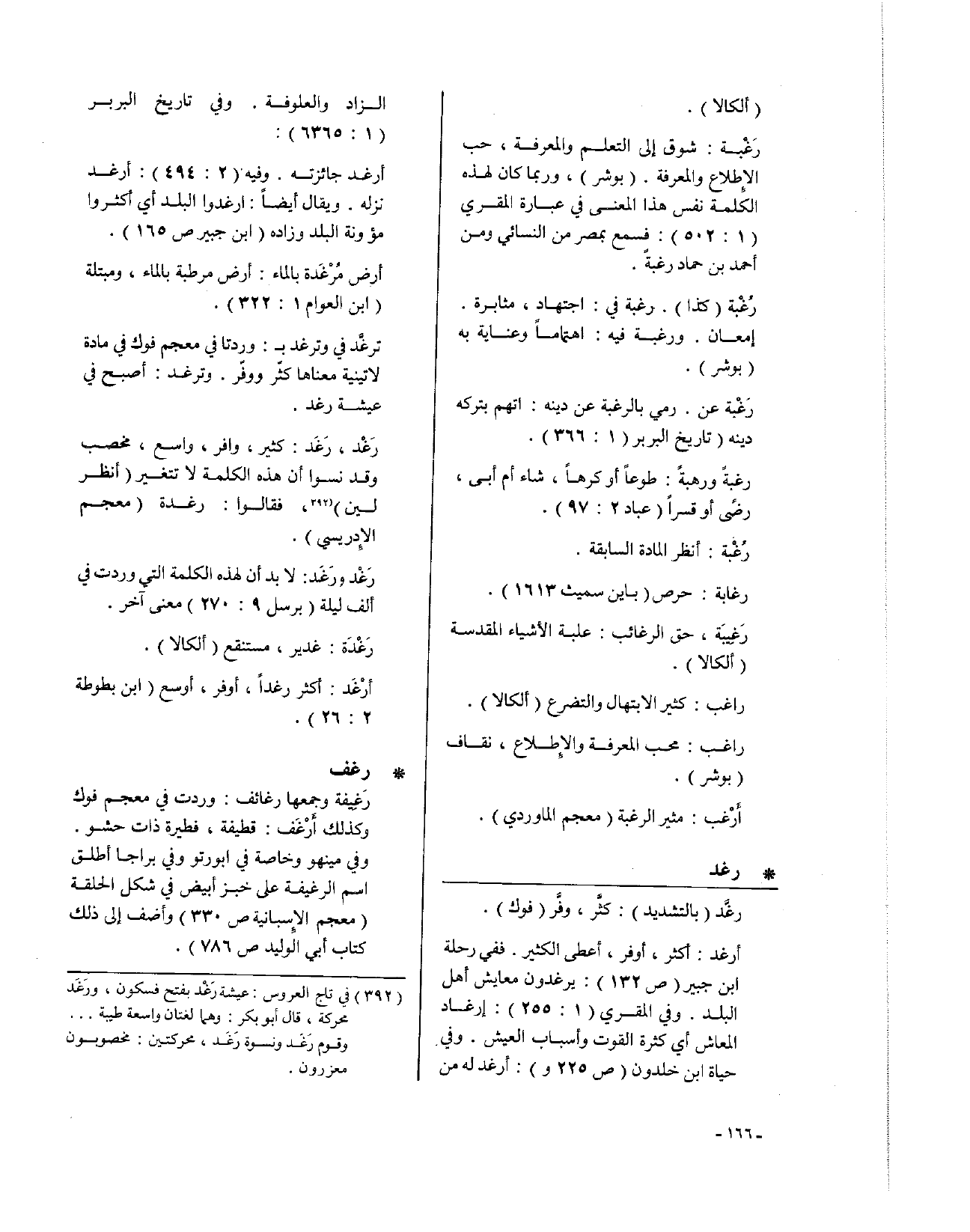 • رغد: رغَّد (بالتشديد): كثَّر، وفَّر (فوك) أرغد: أكثر، أوفر، أعطى الكثير. ففي رحلة ابن جبير (ص132): يرغدون معايش أهل البلد. وفي المقري (1: 255): إرغاد المعاش أي كثرة القوت وأسباب العيش. وفي حياة ابن خلدون (ص255 و): أرغد له من الزاد والعلوفة، وفي تاريخ البربر (1: 6365): أرغد جائزته، وفيه (2: 494): أرغد نزله. ويقال أيضاً: ارغدوا البلد أي أكثروا مؤونة البلد وزاده (ابن جبير ص165).
