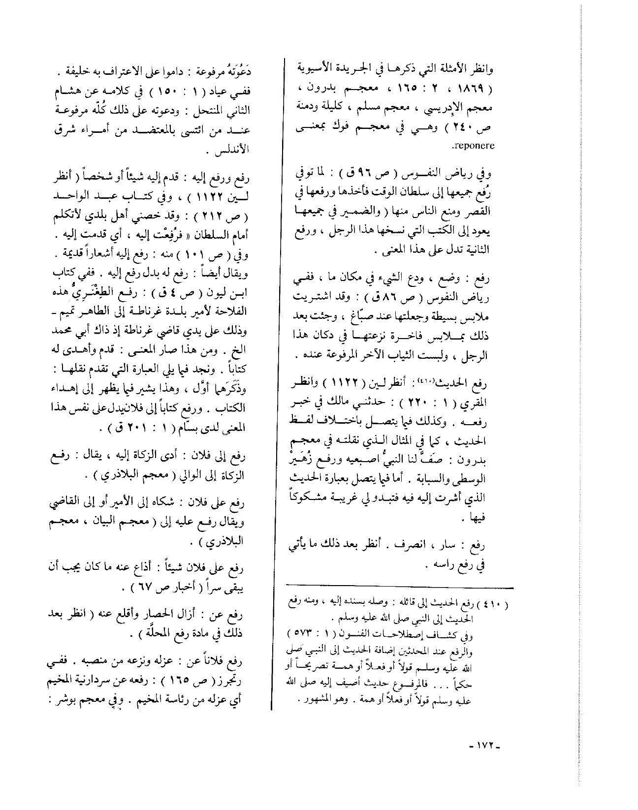 رفع الحديث، انظر لين (1122) وانظر المقري (1: 220): حدثني مالك في خبر رفعه. وكذلك فيما يتصل باختلاف لفظ الحديث، كما في المثال الذي نقلته في معجم بدرون: صَفَّ لنا النبيُّ إصبعيه ورفع زُهَيرْ الوسطى والسبابة. أما فيما يتصل بعبارة الحديث الذي أشرت إليه فتبدو لي غريبة مشكوكاً فيها.
