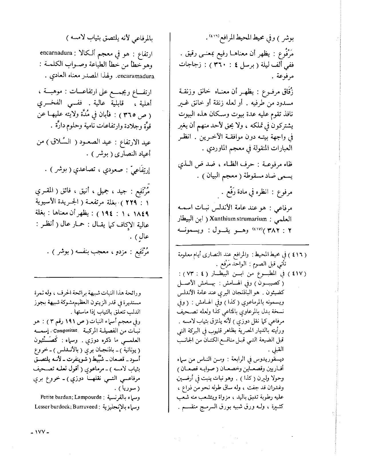 مرفاعي: هو عند عامة الأندلس نبات اسمه العلمي: Xanthium strumarium ( ابن البيطار 2: 382) وهو يقول: ويسمونه بالمرفاعي لأنه يلتصق بثياب لامسه.