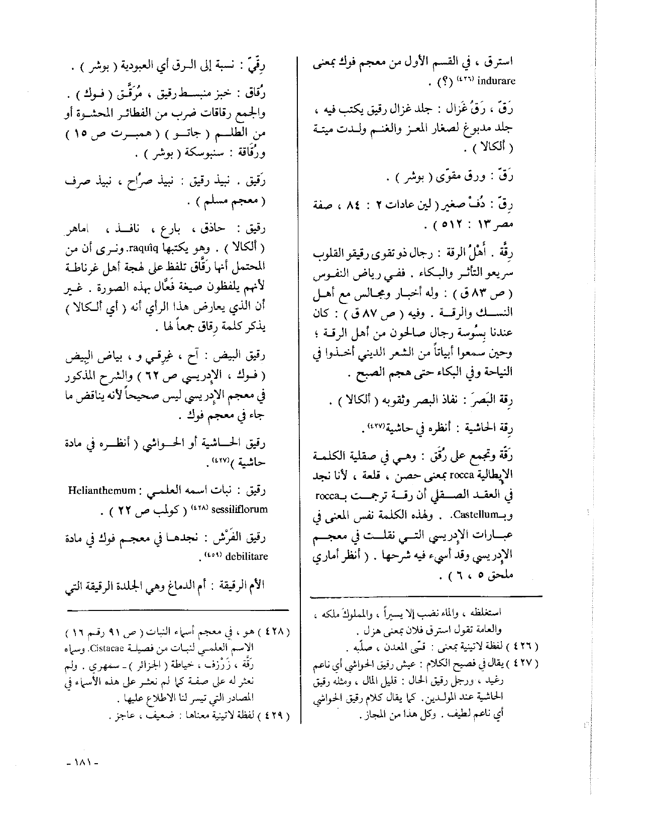 رَقّة وتجمع على رُقَق: وهي في صقلية الكلمة الإيطالية rocca بمعنى حصن، قعلة، لأنا نجد في العقد الصقلي أن رقة ترجمت ب rocca وب Castellum. ولهذه الكلمة نفس المعنى في عبارات الإدريسي التي نقلت في معجم الإدريسي وقد أسيء فيه شرحها (انظر أماري ملحق 5، 6).