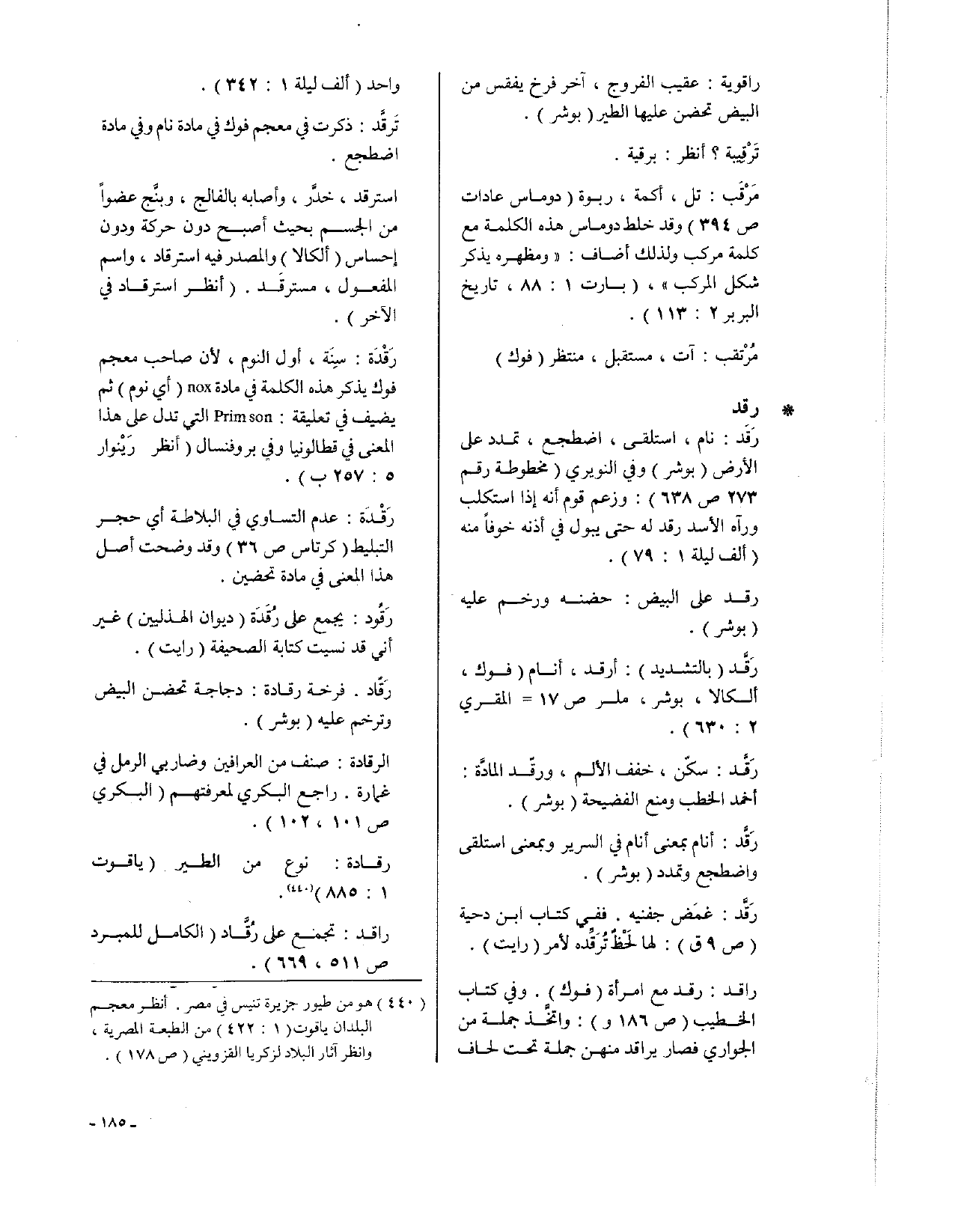 • رقد: رَقَد: نام، استلقى، اضطجع، تمدد على الأرض (بوشر)، وفي النويري (مخطوطة رقم 273 ص638): وزعم قوم أنه إذا استكلب ورآه الأسد رقد له حتى يبول في أذنه خوفاً منه (ألف ليلة 1: 79).