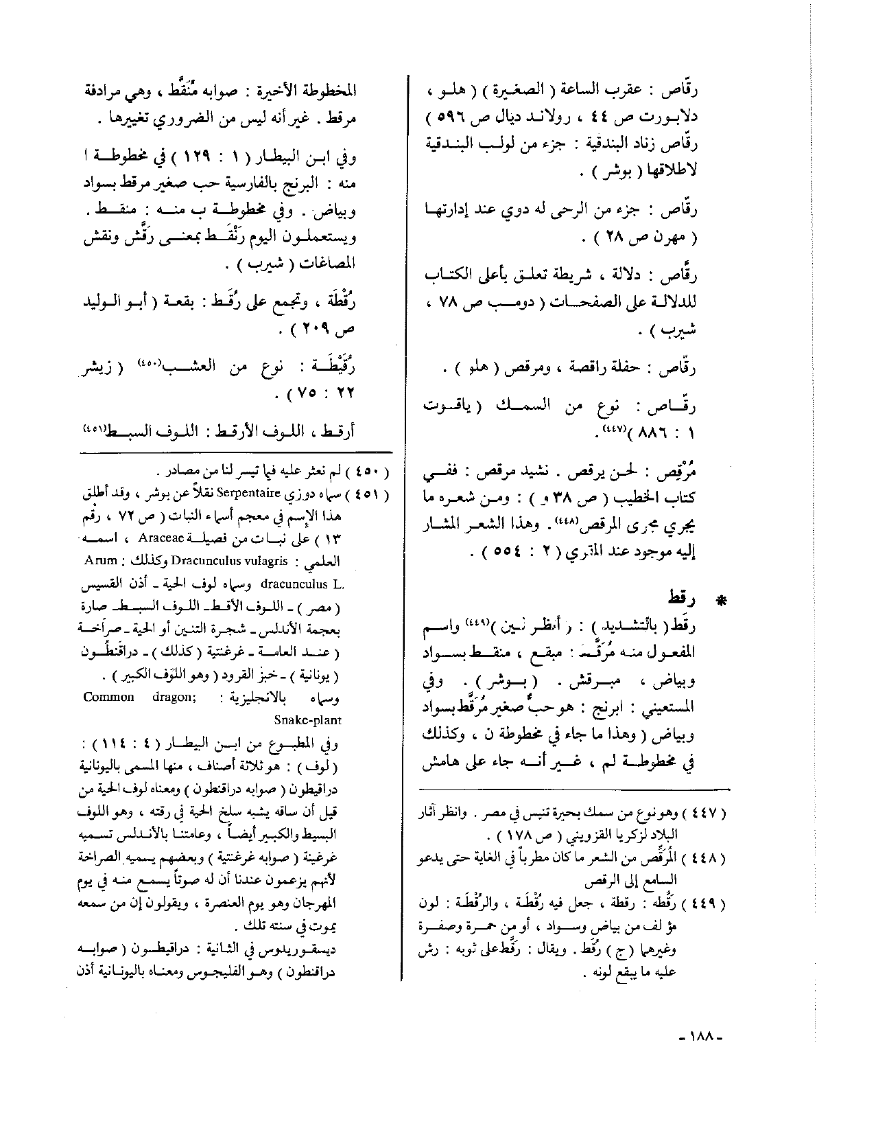 • رقط: رقَط (بالتشديد): انظر لين، واسم المفعول منه مُرَقَّط: مبقع، منقط بسواد وبياض، مبرقش (بوشر). وفي المستعيني: ابرنج هو حبٌّ صغير مُرَقَّط بسواد وبياض (وهذا ما جاء في مخطوطة ن، وكذلك في مخطوطة لم)، غير أنه جاء على هامش المخطوطة الأخيرة: صوابه مُنَقَّط، وهي مرادفة مرقط، غير أنه ليس من الضروري تغييرها.