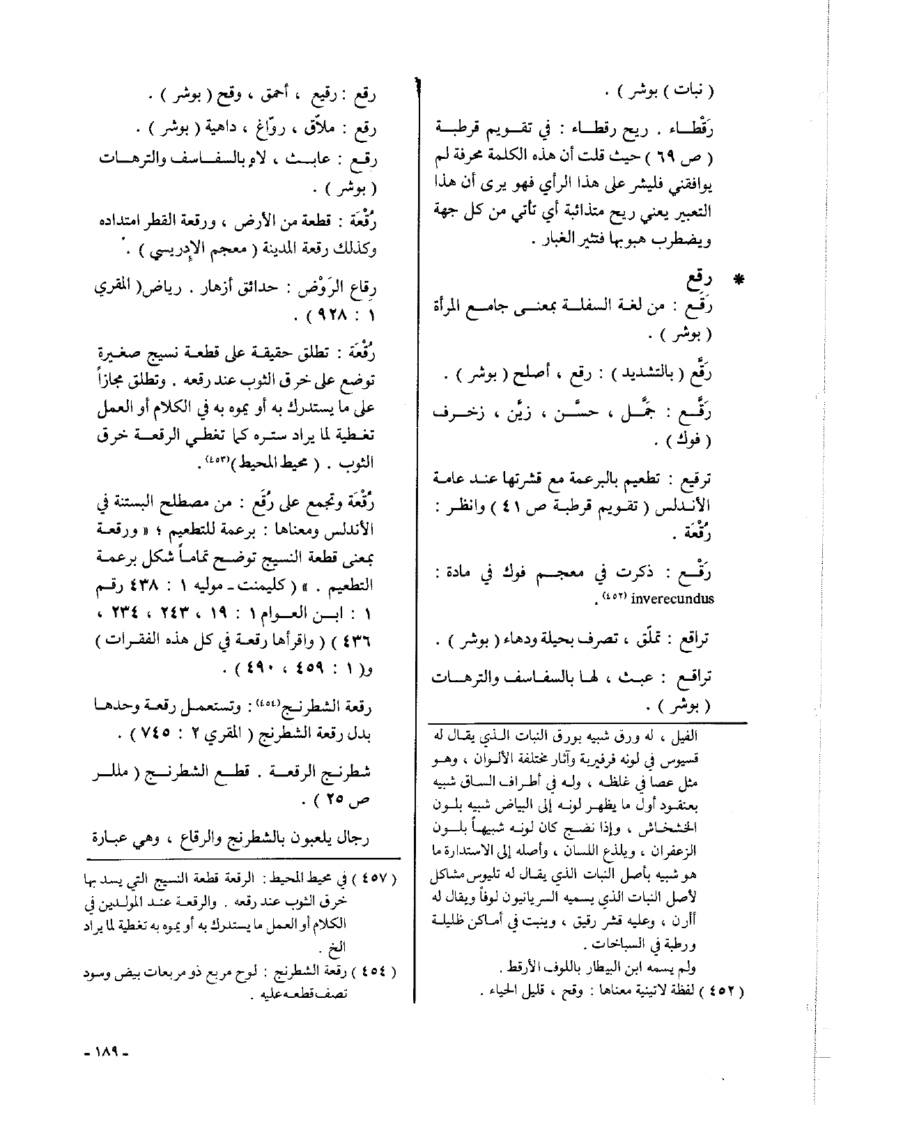 رَقْطاء، ريح رقطاء: في تقويم قرطبة (ص69) حيث قلت أن هذه الكلمة محرفة لم يوافقني فليشر على هذا الرأي فهو يرى أن هذا التعبير يعني ريح متذائبة أي تأتي من كل جهة ويضطرب هبوبها فتثير الغبار.