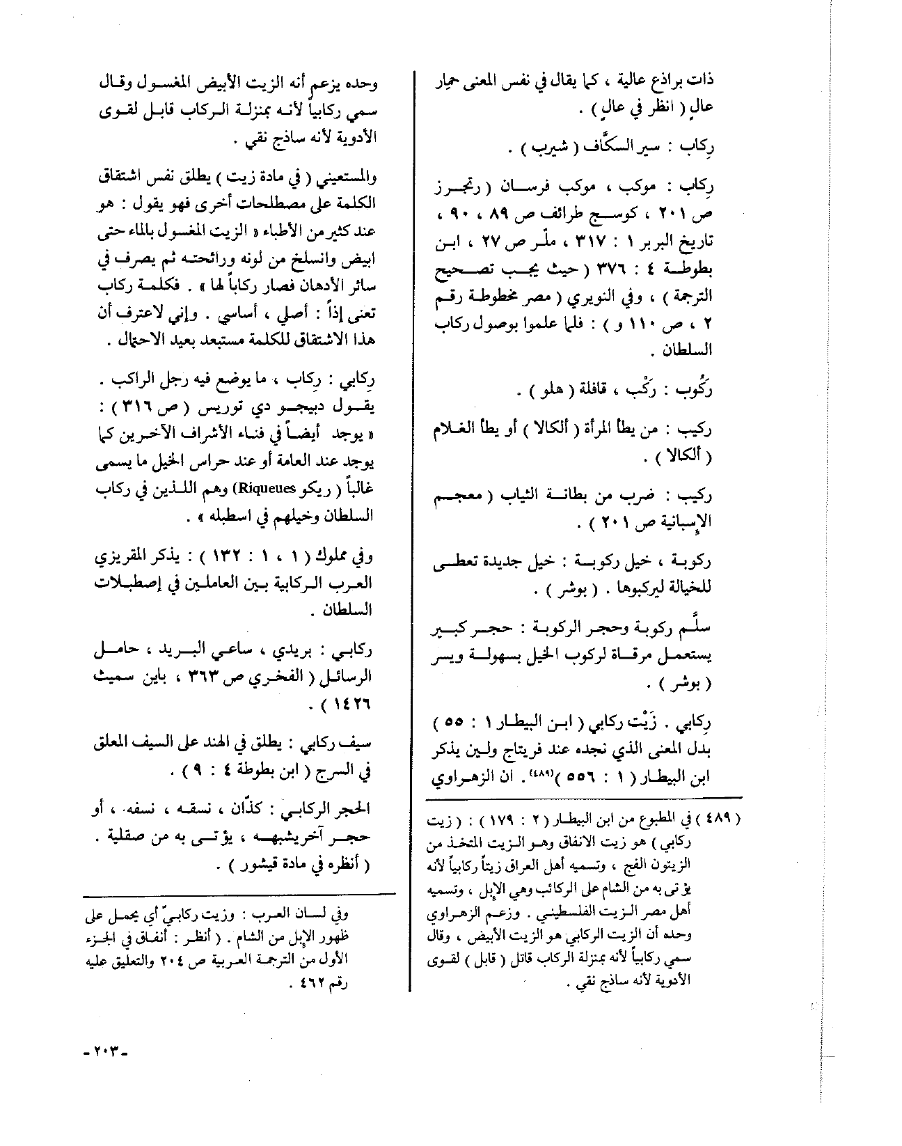 والمستعيني (في مادة زيت) يطلق نفس اشتقاق الكلمة على مصطلحات أخرى فهو يقول: هو عند كثير من الأطباء ((الزيت المغسول بالماء حتى أبيض وانسلخ من لونه ورائحته ثم يصرف في سائر الأدهان فصار ركاباً لها)). فكلمة ركاب تعني إذاً: أصلي، أساسي، وإني لأعترف أن هذا الاشتقاق للكلمة مستبعد بعيد الاحتمال.