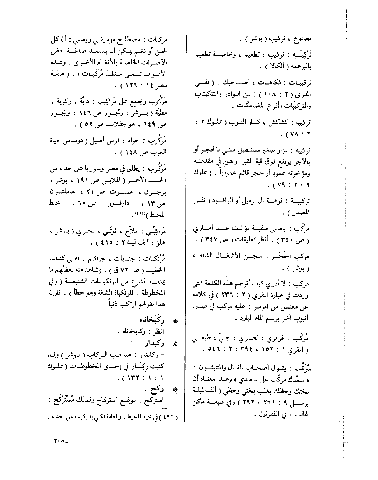 مركب: لا أدري كيف أترجم هذه الكلمة التي وردت في عبارة المقري (2: 236) في كلامه عن مغتسل من المرمر: عليه مركب في صدره أنبوب آخر برسم الماء البارد.