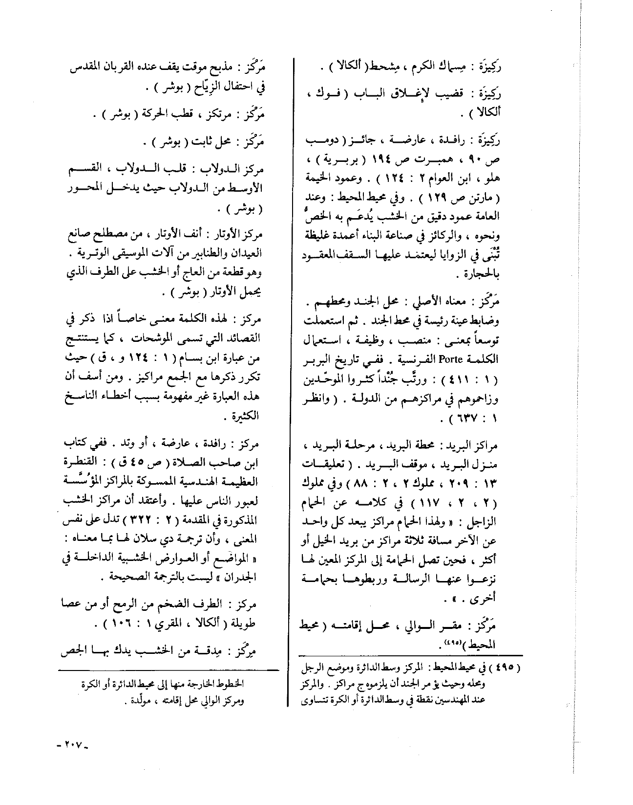 مركز: رافدة، عارضة، أو وتد. ففي كتاب ابن صاحب الصلاة (ص45 ق): القنطرة العظيمة الهندسية الممسوكة بالمراكز المؤُسَّسة لعبور الناس عليها، وأعتقد أن مراكز الخشب المذكورة في المقدمة (2: 322) تدل على نفس المعنى، وأن ترجمة دي سلان لها بما معناه: ((المواضع أو العوارض الخشبية الداخلة في الجدران)) ليست بالترجمة الصحيحة.