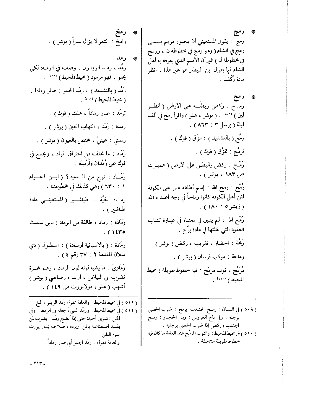 • رمج: رمج: يقول المستعيني أن بخور مريم يسمى رمج في الشام (وهو رمج في مخطوطة ن، ورمح في مخطوطة ل) غير أن الاسم الذي يعرفه به أهل الشام فيما يقول ابن البيطار هو غير هذا، انظر مادة رُكْف.