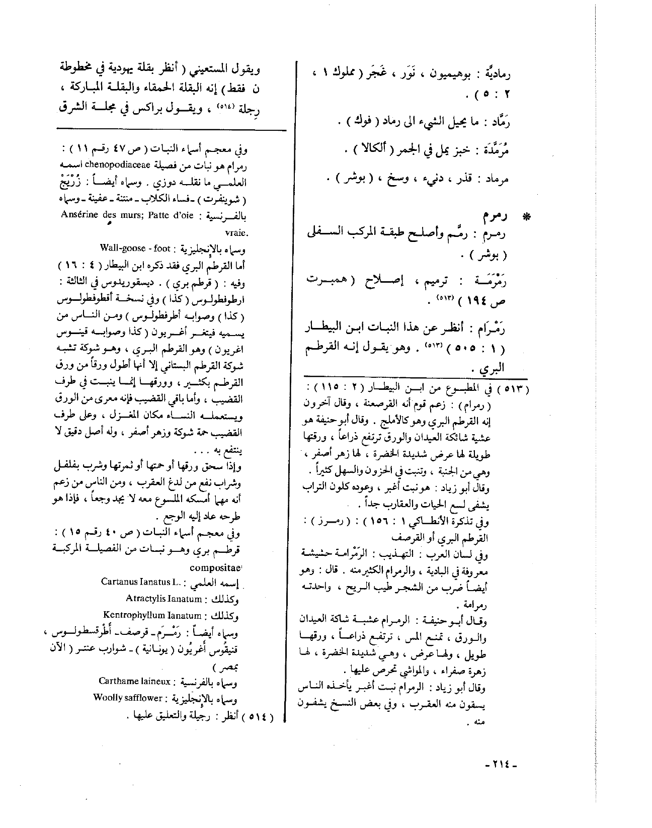 رَمْرَام: انظر عن هذا النبات ابن البيطار (1: 505)، وهو يقول إنه القرطم البري.