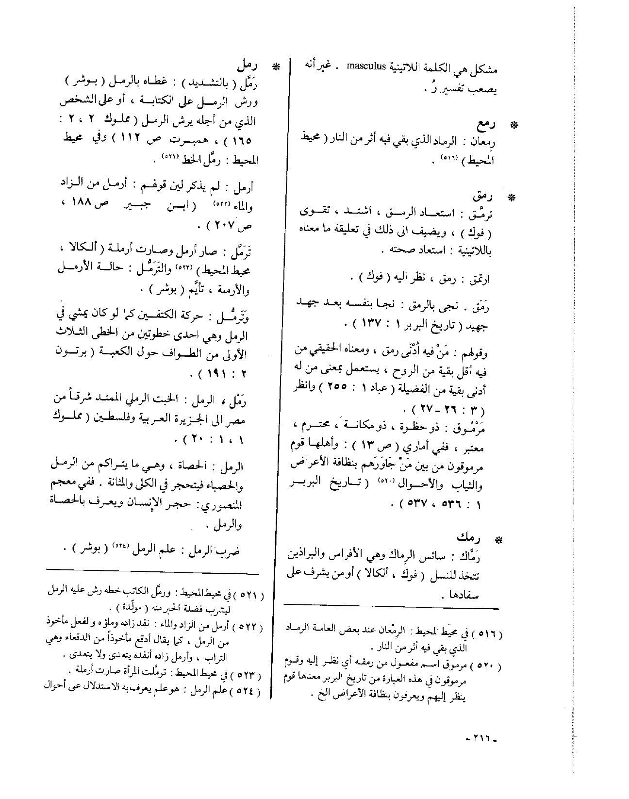 • رمل: رَمَّل (بالتشديد): غطاه بالرمل (بوشر)، ورش الرمل على الكتابة، أو على الشخص الذي من أجله يرش الرمل (مملوك 2، 2: 165، همبرت ص112). وفي محيط المحيط: رمَّل الخط.