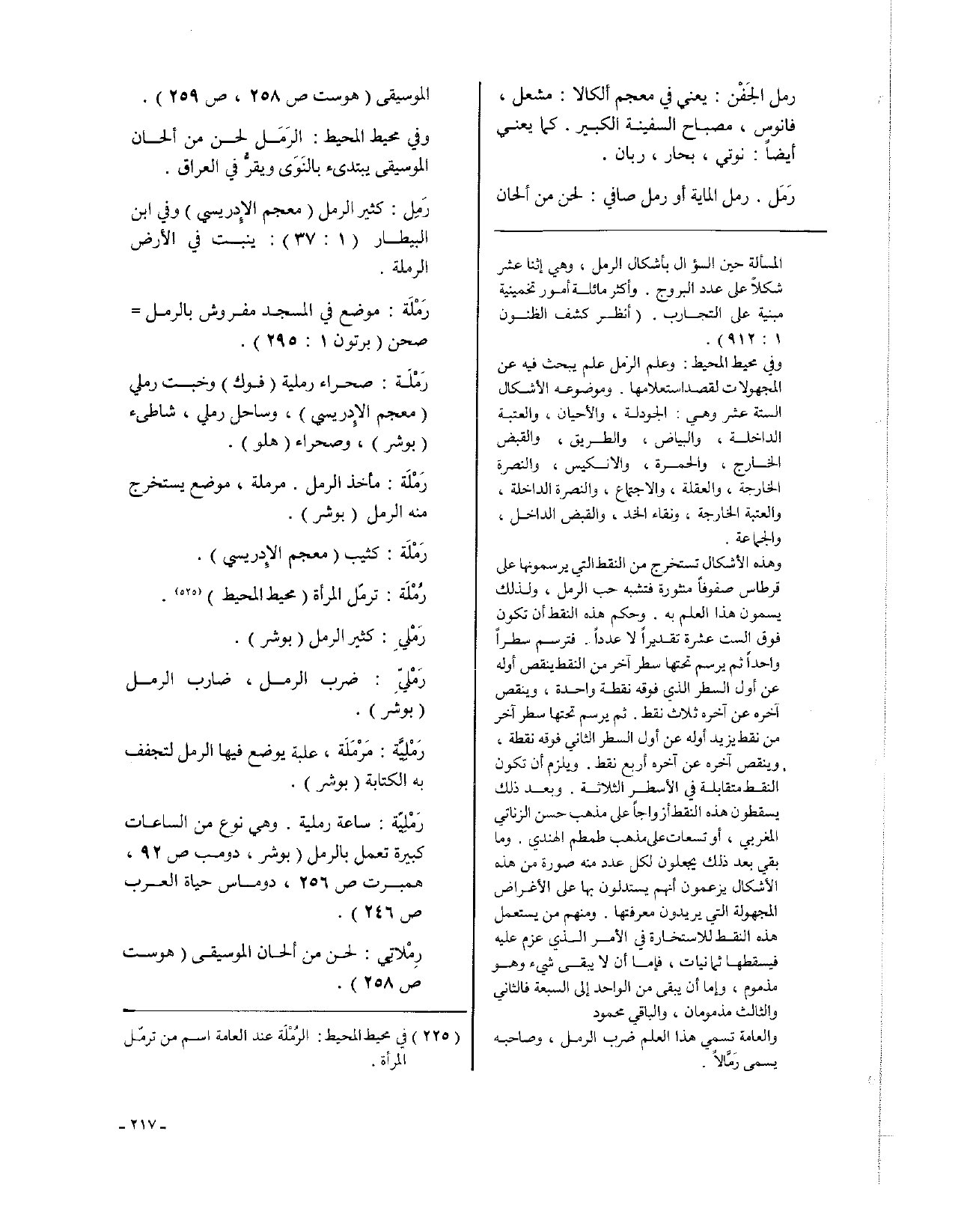 وفي محيط المحيط: الرَمَل لحن من ألحان الموسيقى يبتدئ بالنَوَى ويقرُّ في العراق.