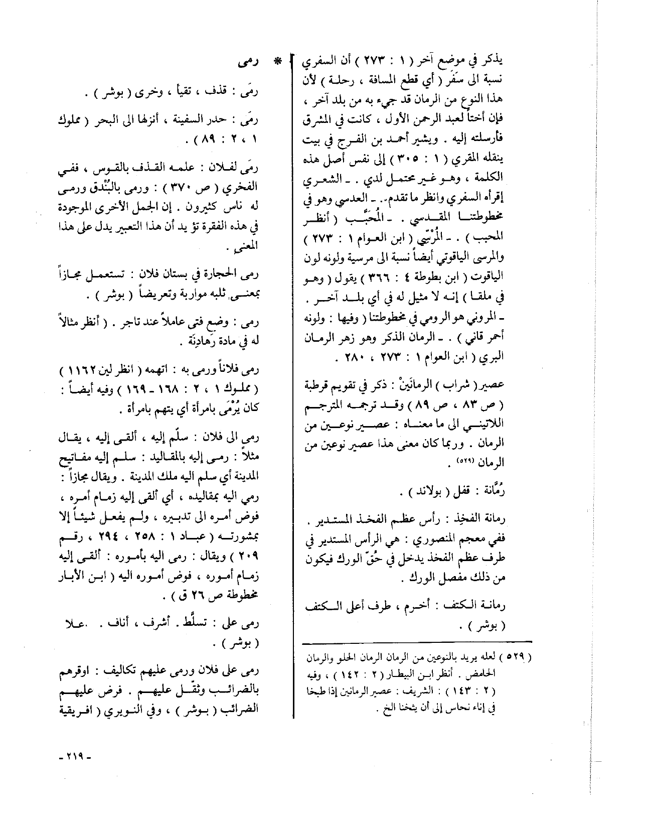 يذكر في موضع آخر (1: 273): أن السفري نسبة إلى سَفَر (أي قطع المسافة، حلة) لأن هذا النوع من الرمان قد جيء به من بلد آخر، فإن أختاً لعبد الرحمن الأول، كانت في المشرق فأرسلته إليه. ويشير أحمد بن الفرج في بيت ينقله المقري (1: 305) إلى نفس أصل هذه الكلمة، وهو محتمل لدي. - الشعري اقرأه السفري وانظر ما تقدم. - العدسي وهو في مخطوطتنا المقدسي. - المُحَبَّب (انظر المحبب). - المُرْسِّي (ابن العوام 1: 273)، والمرسى الياقوتي أيضاً نسبة إلى مرسية ولونه لون الياقوت (ابن بطوطة 4: 366)، يقول (وهو في ملقا) إنه لا مثيل له في أي بلد آخر. - المروني هو الرومي في مخطوطتنا (وفيها: ولونه أحمر قاني). - الرمان الذكر وهو زهر الرمان البري (ابن العوام 1: 273، 280).