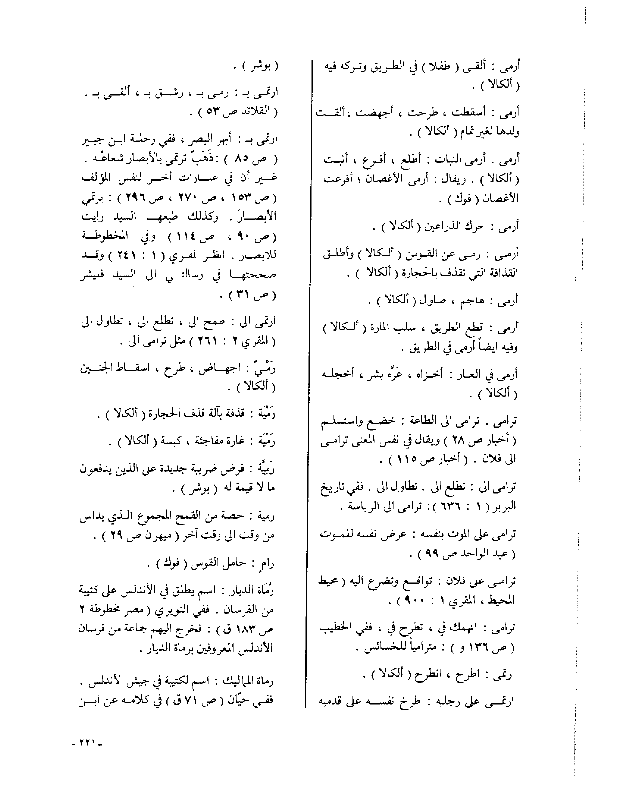 ارتمى ب: أبهر البصر، ففي رحلة ابن جبير (ص85): ذَهَبٌ ترتمي بالأبصار شعاعُه. غير أن في عبارات أخر لنفس المؤلف (ص153، ص270، ص296): يرتمي الأبصارَ. وكذلك طبعها السيد رايت (ص90، ص114)، وفي المخطوطة للأبصار، انظر المقري (1: 241) وقد صححتها في رسالتي إلى السيد فليشر (ص31).