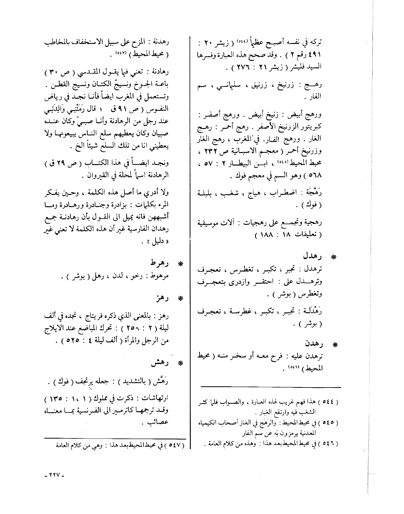 ولا أدري ما أصل هذه الكلمة، وحين يفكر المرء بكلمات: بزادرة وجنادرة ورهادرة وما أشبههن فإنه يميل إلى القول بأن رهادنة جمع رهدان الفارسية غير أن هذه الكلمة لا تعني غير ((دليل)).