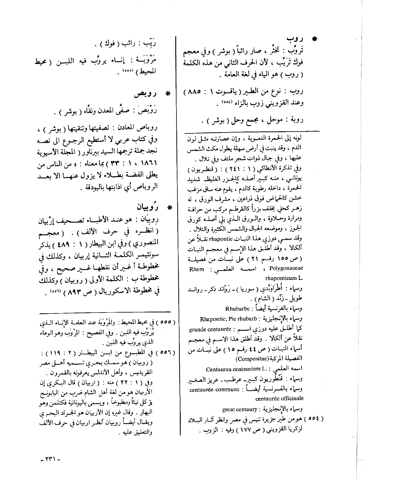 • رُوبيان: رِوبِيَان: هو عند الأطباء تصحيف إرْبيان (أنظره في حرف الألف) (معجم المنصوري)، وفي ابن البيطار (1: 489) يذكر سونثيمر الكلمة الثانية إربيان، وكذلك في مخطوطة أغير أن نقطها غير صحيح، وفي مخطوطة ب: الكلمة الأولى (روبيان) وكذلك في مخطوطة الاسكوريال (ص893).